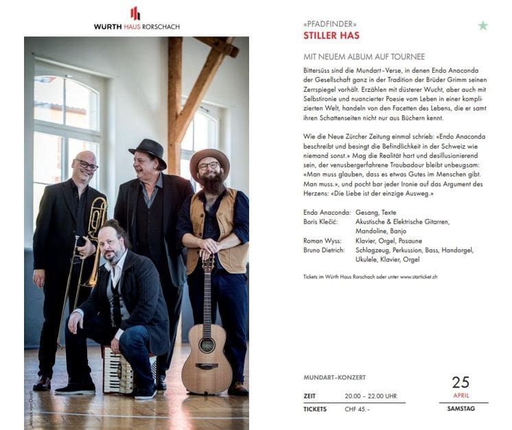 Stiller Has braucht man auch hier nicht näher vorzustellen. Das neue Album „Pfadfinder“ erscheint am 6. März 2020. Das passende Konzert dazu gibt es im Würth Haus in Rorschach am Samstag, 25. April 2020. Es wird der einzige Auftritt dieser Tournee in unserer Gegend sein. Tickets sind im Würth Haus oder bei Starticket erhältlich. Das Tagblatt hat gestern das neue Album vorgestellt (Wochenende, Seite 5).