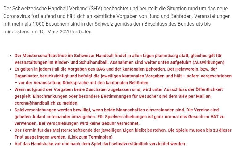 Und nun ist es natürlich auch so, dass diese Diskussionen rund um den Corona-Virus auch die HandballerInnen betrifft. Am letzten Donnerstag wurde nun bekannt, dass die Cup-Final-Spiele, die am 15.März in Gümligen hätten stattfinden sollen, bis auf weiteres verschoben werden. Einige Spiele in den verschiedenen Ligen finden mit begrenzter Zuschauerzahl oder unter Ausschluss der Öffentlichkeit statt bzw. wurden bereits verschoben. Zudem hat auch die Gemeine Goldach reagiert und die Vereine explizit auf die kantonalen Vorgaben hingewiesen. Diese schreiben mitunter vor, dass z.B. bei den Eingängen entsprechende Hinweise und Eingangskontrollen gemacht werden müssen. „Natürlich werden wir als Verein diesen Vorgaben nachkommen – sofern der Spielbetrieb nicht bereits in den nächsten Tagen eingestellt wird und die Massnahmen dadurch obsolet werden. Für uns zählt aber nicht nur der Spielbetrieb, sondern eben auch der Trainingsbetrieb – der unseres Erachtens in dieser Diskussion nicht ausgeblendet werden darf. Deshalb haben wir die Trainer vor Tagen bereits auf das Thema sensibilisiert (z.B. wer erkältet ist geht nach Hause, …). Und natürlich überwachen wir die Situation täglich, um möglichst schnell reagieren zu können“, schreibt der HC GoRo in einer Mitteilung. Die Informationsseite des Verbandes findet man hier.