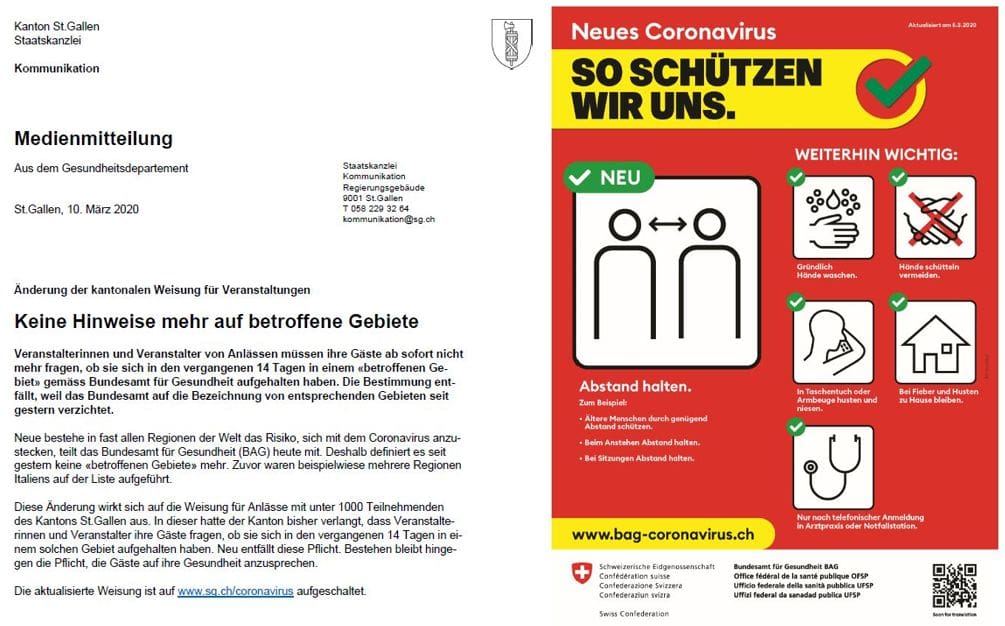 Diese Änderung wirkt sich auf die Weisung für Anlässe mit unter 1000 Teilnehmenden des Kantons St.Gallen aus. In dieser hatte der Kanton bisher verlangt, dass Veranstalterinnen und Veranstalter ihre Gäste fragen, ob sie sich in den vergangenen 14 Tagen in einem solchen Gebiet aufgehalten haben. Neu entfällt diese Pflicht. Bestehen bleibt hingegen die Pflicht, die Gäste auf ihre Gesundheit anzusprechen. Die aktualisierte Weisung ist auf http://www.sg.ch/coronavirus aufgeschaltet.