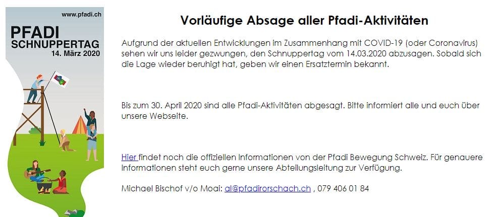 Vorläufige Absage aller Pfadi-Aktivitäten in Rorschach: „Aufgrund der aktuellen Entwicklungen im Zusammenhang mit COVID-19 (oder Coronavirus) sehen wir uns leider gezwungen, den Schnuppertag vom 14.03.2020 abzusagen. Sobald sich die Lage wieder beruhigt hat, geben wir einen Ersatztermin bekannt. Bis zum 30. April 2020 sind alle Pfadi-Aktivitäten abgesagt. Bitte informiert alle und euch über unsere Webseite (www.pfadirorschach.ch). Für genauere Informationen steht euch gerne unsere Abteilungsleitung zur Verfügung. Michael Bischof v/o Moai: al@pfadirorschach.ch , 079 406 01 84.