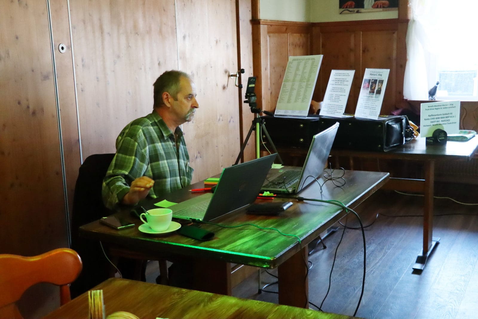 Marcus C. Held wird während diesem Marathon einzig von Ruedi Burkhard, Präsident vom Verein Paraboat unterstützt, der für den technischen Support der Übertragung verantwortlich ist. Und bei meinem angekündigten Augenschein wurde auch mir sofort bewusst, dass der Sicherheitsabstand eingehalten wird.