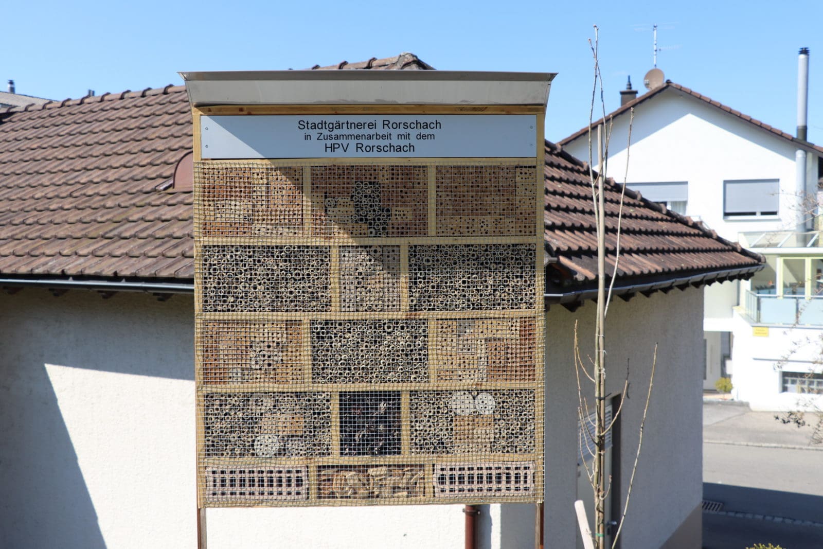 Insektenhotels sind der Inbegriff von Biodiversität und haben in den letzten Jahren Einzug in vielen Gärten gehalten. Insektenhotels bieten unter anderem Wildbienen Lebensraum und sind vor allem im Frühjahr rege belebt. In der Stadt Rorschach findet man im «Rubinpark» ein Prototyp einer solch erwähnten Behausung. Das Insektenhotel hat die Masse 100x 100cm und wurde in Zusammenarbeit mit der HPV Rorschach erstellt.