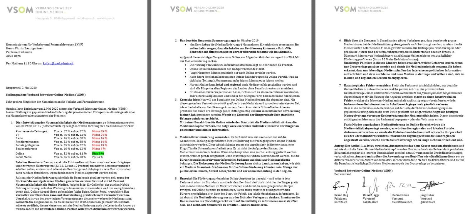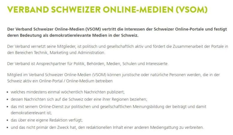 Der Verband der regionalen und lokalen Schweizer Online-Medien (VSOM) hat sich gegenüber Bundesbern in einer erbetenen Stellungnahme zur Medienförderung geäussert. Er warnt darin vor der markt verzerrenden Idee, im Online-Bereich nur abonnierte Medien zu fördern. Der Verband will dieses Vorhaben notfalls durch ein Referendum oder eine Volksinitiative bekämpfen. Nachstehend die heutige Medienmitteilung des Verbandes und die Stellungnahme vom 7. Mai an die Kommissionen für Verkehr und Fernmeldewesen (KVF).