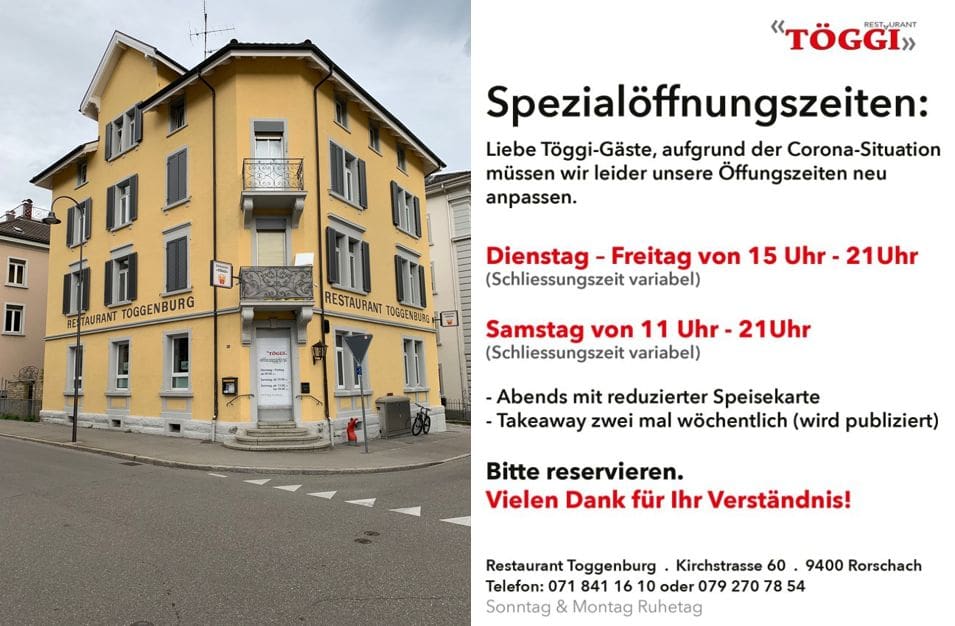 Morgen ab 15 Uhr offen und mit variabler Schliesszeit. Corona ist halt überall. Morgen Dienstag gibt es die feinen Kutteln a là Marianne. Das Töggi bleibt am Ball …