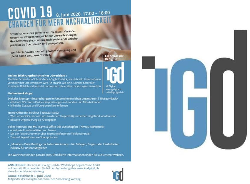 Während einige seit Wochen virtuos im Homeoffice werken, sind andere noch unsicher, wie sie sich angesichts der Lockdown-Lockerungen nun weiterhin digital organisieren wollen. Der neueste Anlass der IG Digital geht der Frage nach, ob und wenn ja, wie Arbeitsprozesse überdacht und angepasst werden sollen. Und: Was bleibt von all den Änderungen auch nach Corona sinnvollerweise erhalten? Matthias Schmid von der Schmid-Fehr AG wird aus der Sicht eines «Gwerblers» einen Einblick geben, wie sich sein Unternehmen verändert hat und vermutlich verändern wird. Die Teilnehmenden können sich anschliessend in einem der drei Workshops «Digitales Meetup», «Home-Office» und «Volles Potenzial MS Teams / Office 365» vertiefen. Anmeldung und weitere Informationen: www.ig-digital.ch