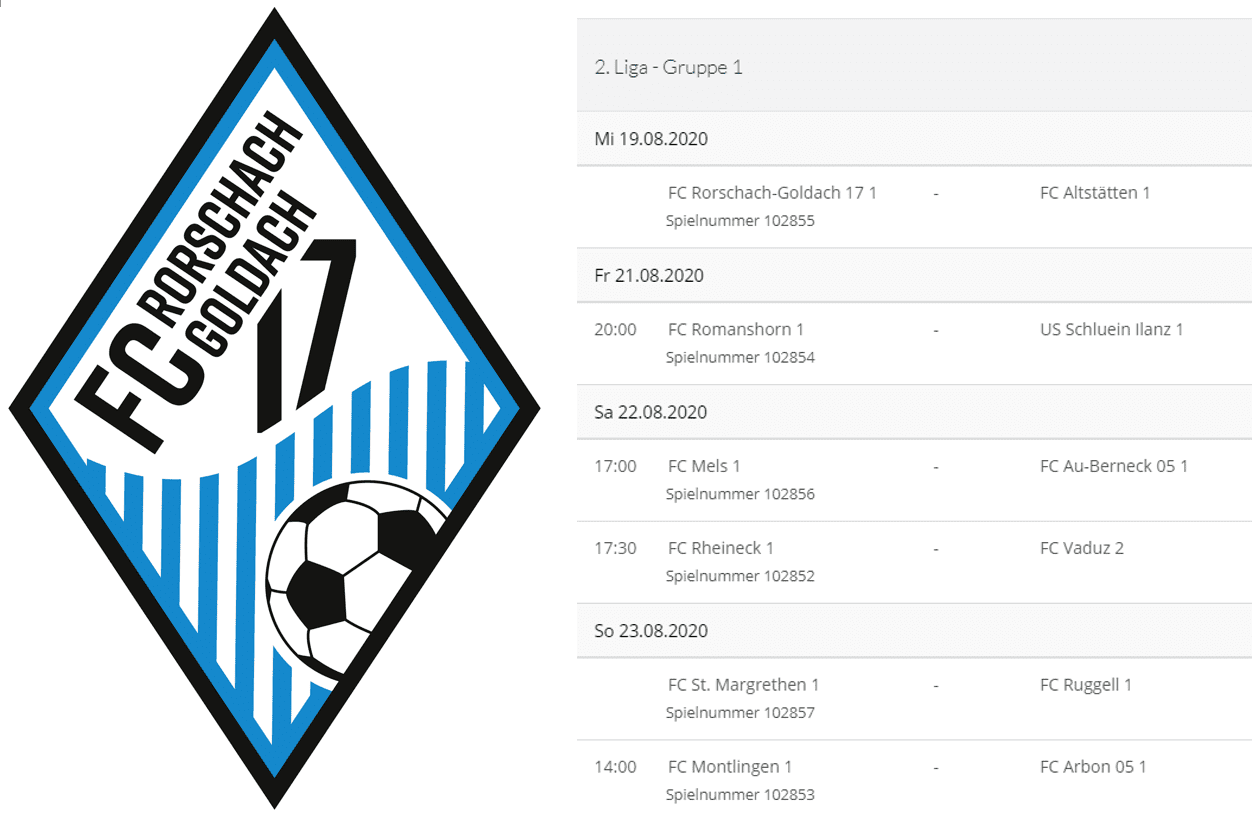 Mit einem Heimspiel gegen den FC Altstätten startet der FC Rorschach-Godach 17 am Mittwoch, 19. August 2020, in die neue Saison. Am 29. August steht das Auswärtsspiel gegen die US Schluein Ilanz auf dem Spielplan. Dann folgen gleich zwei Derbys. Am 5.9. auf Kellen gegen Arbon 05 und eine Woche später beim FC Rheineck. Am 26. September empfängt der FC RG 17 den FC Montlingen. Natürlich immer vorausgesetzt, dass sich das mit den Corona-Massnahmen günstig entwickelt.
