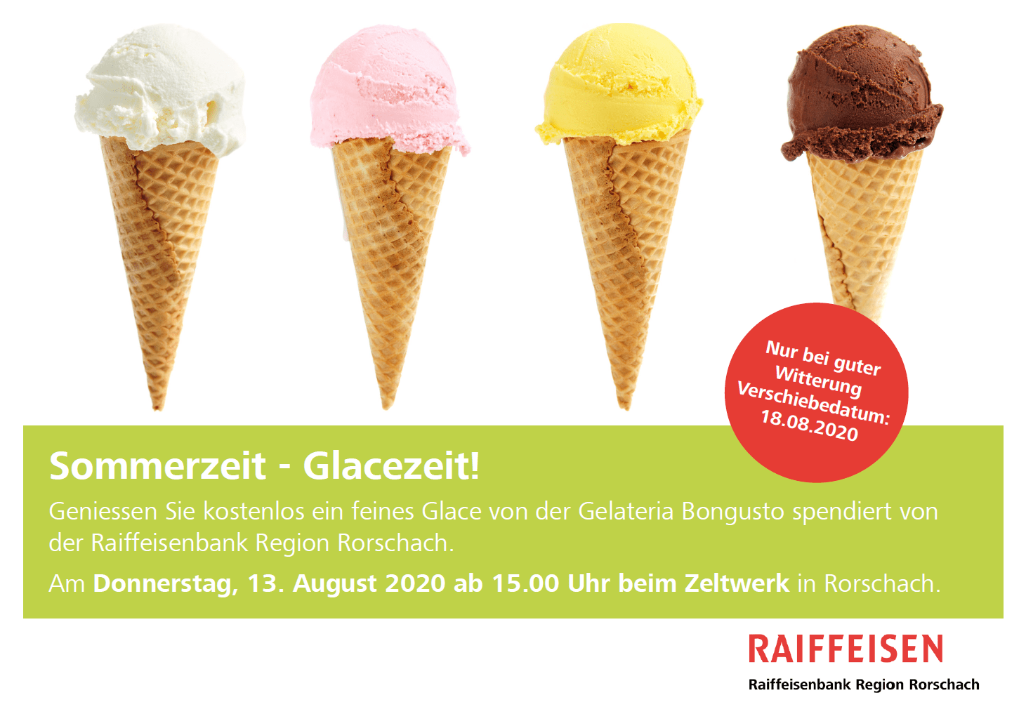 Die Raiffeisenbank der Region Rorschach organisiert auch dieses Jahr wieder eine Glaceaktion. Diesnal mit speziell feiner Gelati von der Gelateria Bongusto, verteilt am nächsten Donnerstag, 13. August 2020, ab 15 Uhr im Zelt-Werk auf dem Rorschacher Hafenplatz. Mehr Infos findet man auf dem Flyer unten:
