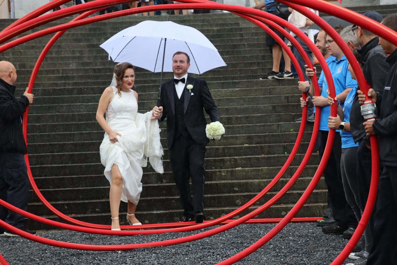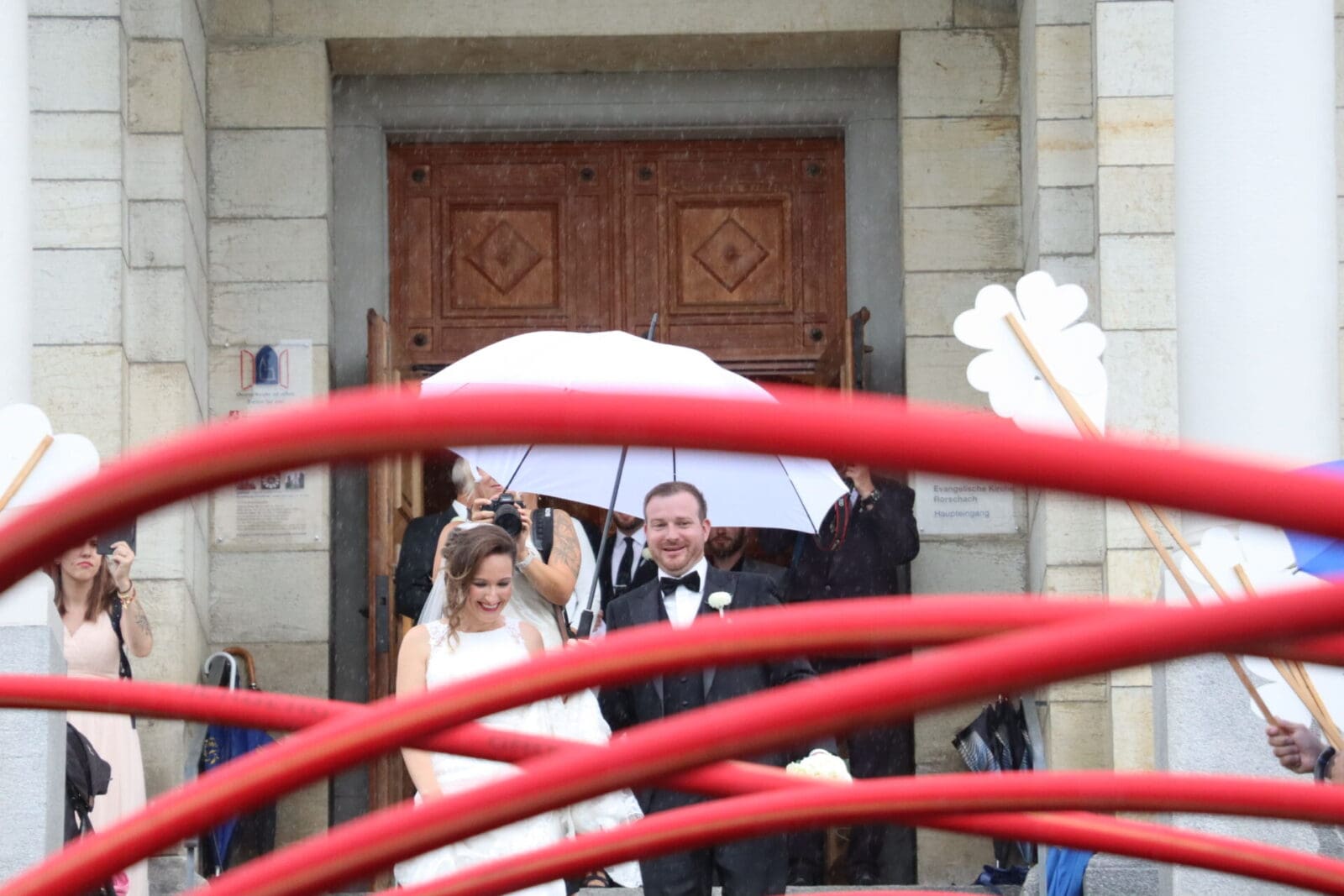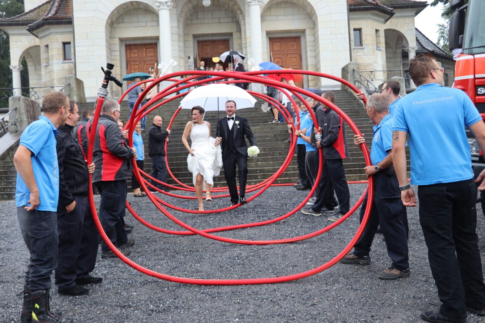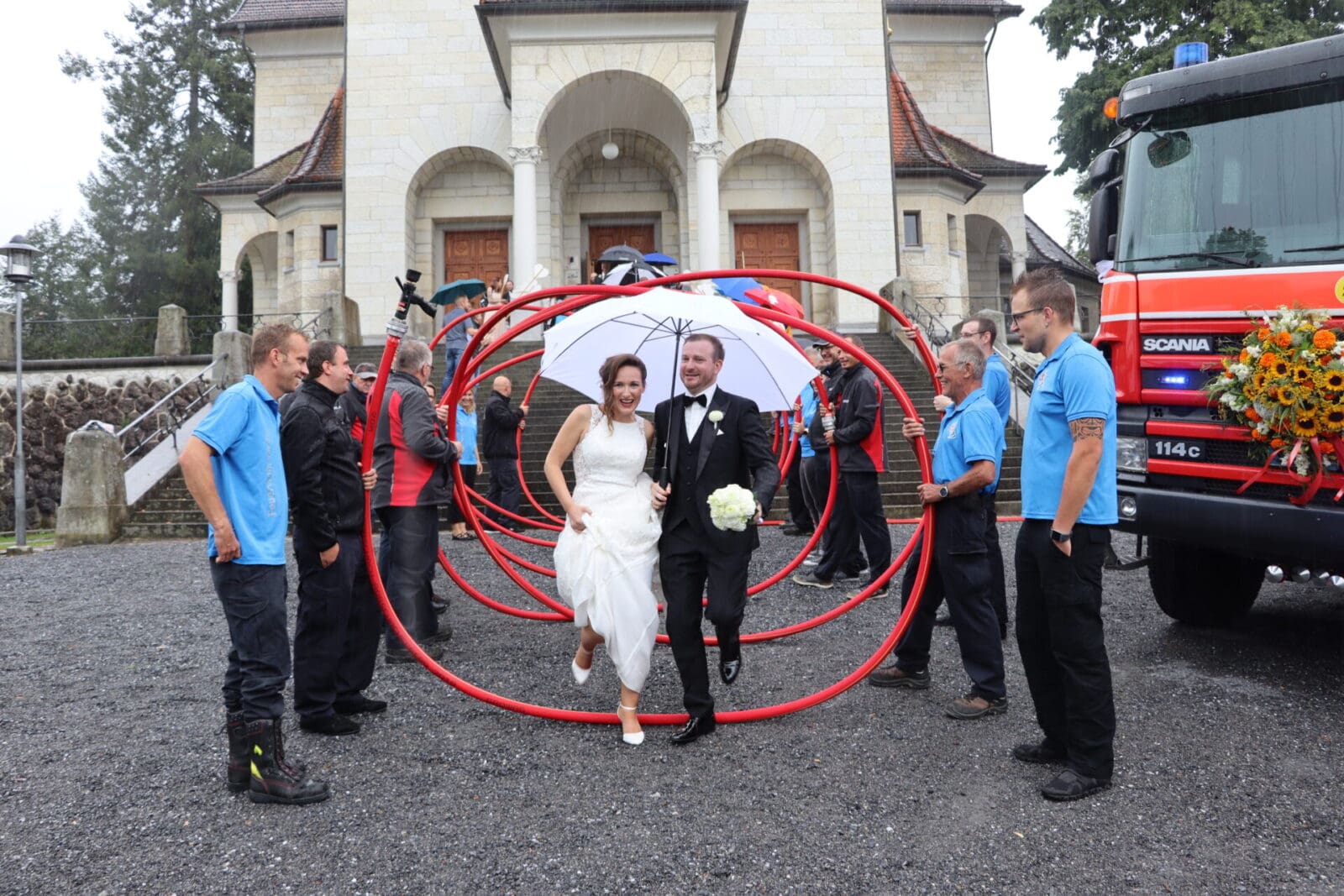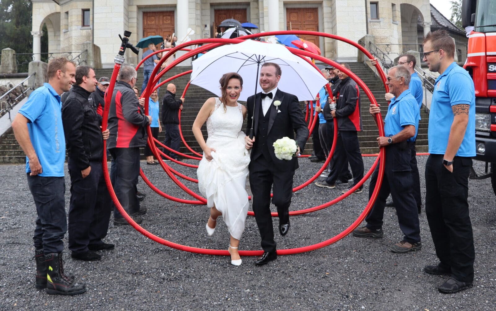 Grosser Bahnhof gestern vor der Evang.-ref. Kirche in Rorschach – eigentlich wie immer, wenn ein Mitglied der Feuerwehr Rorschach-Rorschacherberg heiratet. Gestern war es Benedict, der seine Bianca vor den Traualtar führte. Das Rorschacher Echo stellt sich in die lange Reihe der Gratulanten und wünscht dem Brautpaar von Herzen nur das Beste.