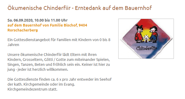 Morgen Sonntag, 06.09.2020, von 10.00 bis 11.00 Uhr auf dem Bauernhof von Familie Bischof in Rorschacherberg. Ein Gottesdienstangebot für Familien mit Kindern von 0 bis 8 Jahren. Die ökumenische Chinderfiir lädt Eltern mit ihren Kindern, Grosseltern, Götti/Gotte zum miteinander Spielen, Singen, Tanzen, Beten und fröhlich sein ein. Keiner ist hier zu jung – jeder ist herzlich willkommen. Zum anschliessenden gemütlichen Beisammensein sind alle herzlich eingeladen. Auf dem bereitstehenden Grill können selbst mitgebrachte Würste gebraten werden. Kontakt: Pfr. Patrick Marchlewitz, Tel. 071 855 48 65.