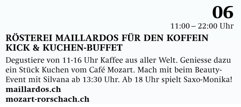 Zelt-Werk: Koffein-Kick, Mozart-Kuchen & Saxo-MonikaThemen:KulturRorschach 6. September 2020 - 06:44Jetzt muss nur noch das Wetter mitmachen … Die Links: maillardos.ch, mozart-rorschach.ch und Monika Popp.Teilen mit: Einen Link per E-Mail an einen Freund senden (Wird in neuem Fenster geöffnet) E-Mail Drucken (Wird in neuem Fenster geöffnet) Drucken Auf Facebook teilen (Wird in neuem Fenster geöffnet) Facebook Auf X teilen (Wird in neuem Fenster geöffnet) X Auf WhatsApp teilen (Wird in neuem Fenster geöffnet) WhatsApp Gefällt mir:Gefällt mir Wird geladen …Newsletter abonnieren Bitte dieses Feld leer lassenBitte wähle, ob Du über jeden neuen Beitrag sofort oder lieber jeden Morgen gegen 9 Uhr eine Zusammenfassung der neusten Beiträge erhalten möchtest.Liste(n) auswählen: Neues vom Echo (Zusammenfassung) Neues vom Echo (Sofortbenachrichtigung) Dieses Feld wird benötigt.Prüfen Sie Ihren Posteingang und den Spamordner, um Ihr Abonnement zu bestätigen.