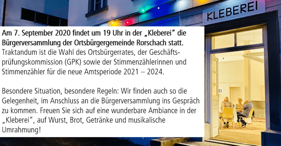 Start ist um 19 Uhr in der Kleberei. Und morgen liest man hier im Rorschacher Echo, was da alles abgegangen ist. Mehr zur Ortsbürgergemeinde findet man hier.