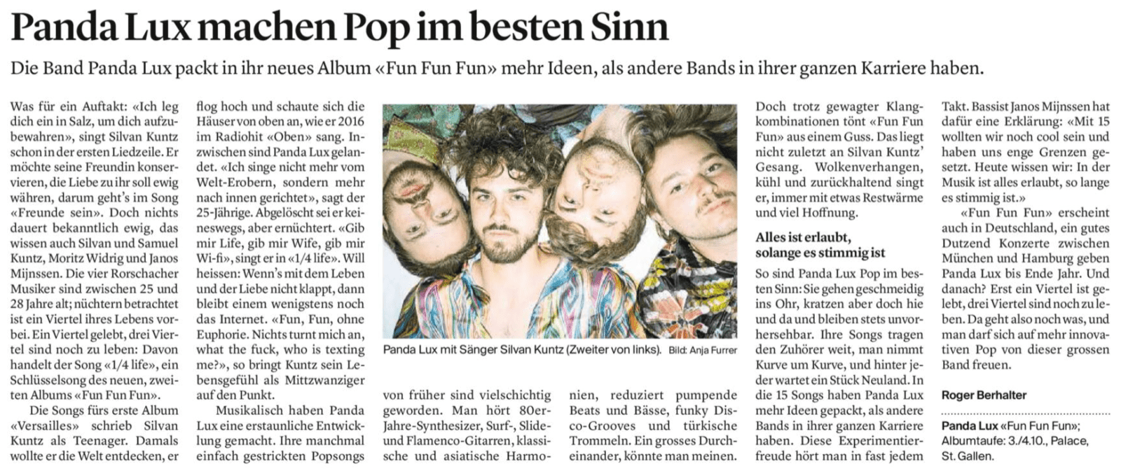 Die Rorschacher Band Panda Lux ist in aller Munde. Die Medien sind entzückt über das neue Album und SRF 3 widmete den vier Jungs am Mittwochabend viel Sendezeit. Morgen und übermorgen werden sie noch mehr im Zentrum stehen, wenn sie im Palace in St. Gallen ihr neues Album „Fun Fun Fun“ gleich zweimal taufen. Da das Konzert morgen Samstag bereits ausverkauft ist, gibt es kurzerhand ein Zusatzgig am Sonntag ab 16 Uhr (Türöffnung).
