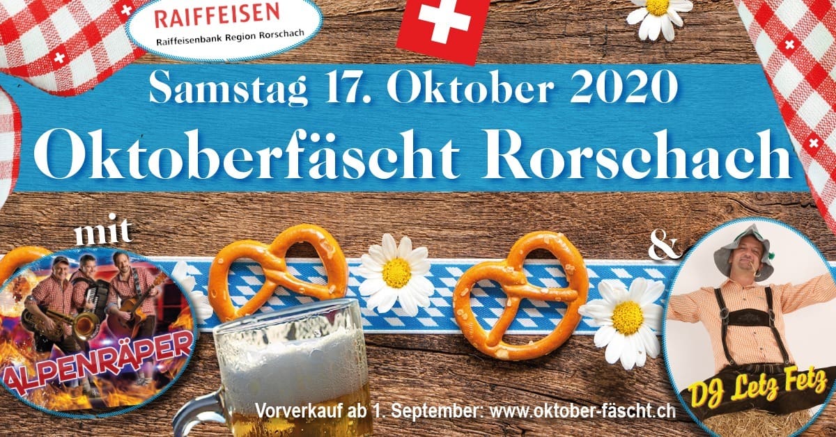 Wie gestern angekündigt kann man ab jetzt 2 Gratistickets für das erste Oktoberfäscht in Rorschach gewinnen. Das geht relativ einfach. Die ersten beiden Rorschacher Echo-LeserInnen, die ein Mail an mich senden, kriegen die Tickets. Das Mail muss die genaue Adresse beinhalten. Die GewinnerInnen bekommen eine Antwort von mir (mit einer Kopie an den Organisator), drucken dieses Mail aus und nehmen es am 17. Oktober 2020 mit und melden sich an der Abendkasse. Alles klar? Viel Glück.