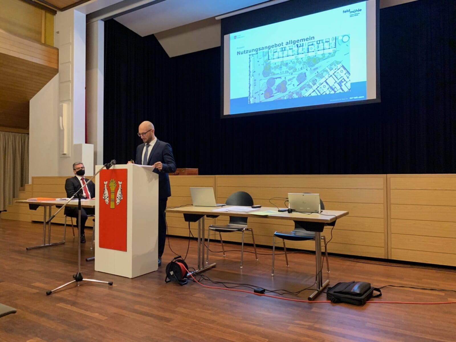 Gestern informierten Stadtpräsident Röbi Raths und Beat Käser, Projektleiter Steiner AG Zürich, über die aktuelle Situation rund um die Feldmühle, die endlich einer neuen Nutzung zugeführt wird. Das jetzt abgeschirmte Areal wird neu offen und einladend einen neuen Stadtkern in unmittelbarer Nähe zum neuen Stadtbahnhof bilden. Seit der letzten Präsentation haben sich einige Änderungen ergeben. Die einzelnen Punkte werden auf dem ca. 30 Minuten dauernden Video (zu finden auf der Homepage der Stadt) erläutert. Da hat es einige ganz spannende Punkte dabei. Röbi Raths sagt ganz am Anfang etwas zur früher einmal geplanten Unterführung und den dazugehörenden Vorstellungen des Stadtrats. Beat Käser erläutert nebst den Gesamtdimensionen auch wichtige kleine Details wie die Offenlegung des kleinen Feldmühlebachs an der Grenze zur Evang.-ref. Kirche. Es lohnt sich auf jeden Fall, das Video anzuschauen. Auf Tagblatt-Online ist bereits der Artikel von Jolanda Riedener aufgeschaltet.