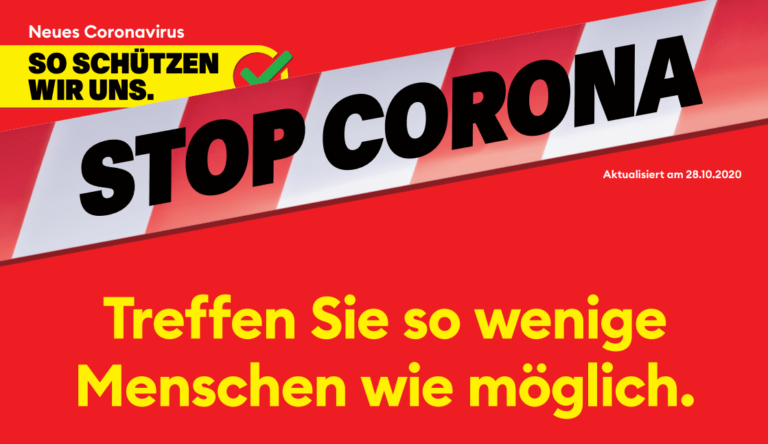 - Maskenpflicht wird weiter ausgedehnt: Seit dem 19. Oktober gilt eine Maskenpflicht für alle Personen in öffentlich zugänglichen Innenräumen sowie in Wartebereichen des öffentlichen Verkehrs und an Bahn- und Flughäfen. Neu muss auch in den Aussenbereichen von Einrichtungen und Betrieben eine Maske getragen werden, wie zum Beispiel Läden, Veranstaltungsorte, Restaurants und Bars oder Wochen- und Weihnachtsmärkte. Eine Maskenpflicht gilt auch in belebten Fussgängerbereichen und überall dort, wo der erforderliche Abstand im öffentlichen Raum nicht eingehalten werden kann – also quasi überall.