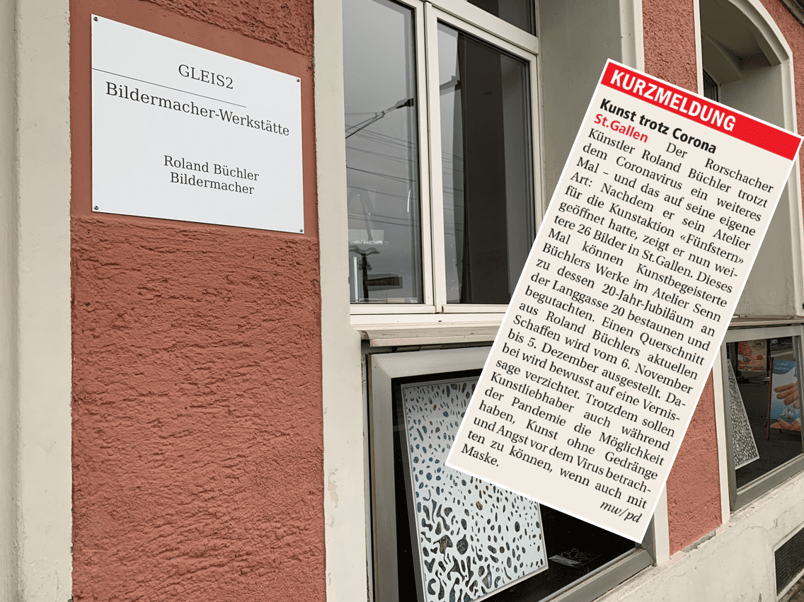 Kunst trotz Corona! Das Atelier Senn in St. Gallen, Kunsthandel und Einrahmungen feiert sein 20 Jahre Jubiläum mit einer Büchler-Ausstellung. Es werden da vom 6. November bis 5. Dezember 2020 insgesamt 26 Bilder vom Rorschacher Künstler Roland Büchler gezeigt. Alle Details zur Ausstellung in St. Gallen finden Interessierte hier.
