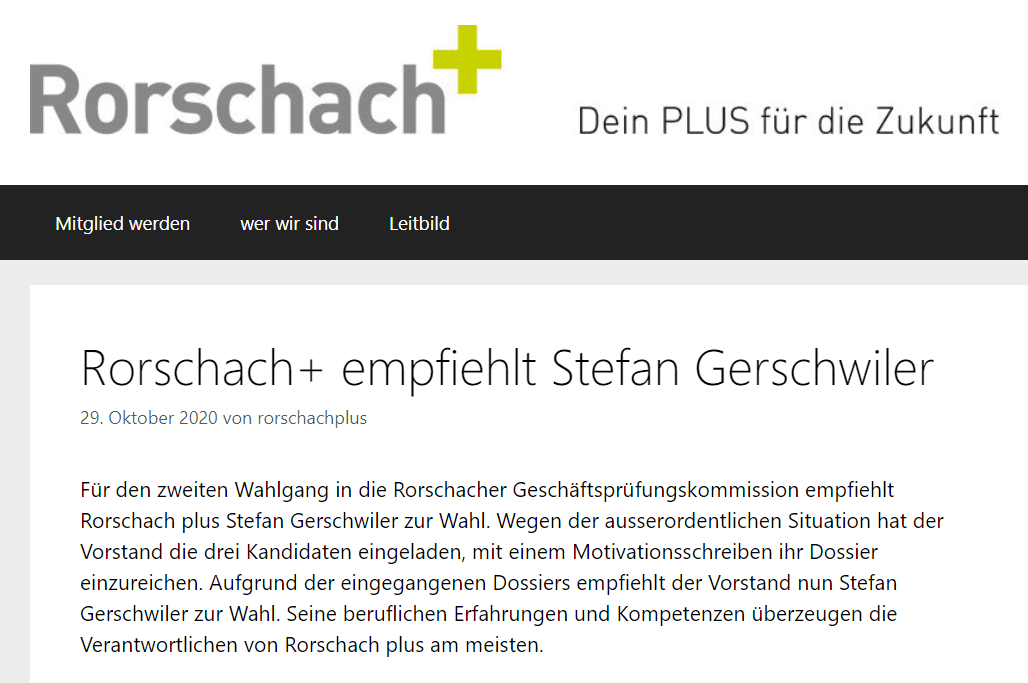 Die Wahlunterlagen sind in dieser Woche in den Briefkästen gelandet. In der Zwischenzeit hat auch noch „Rorschach plus“ eine Empfehlung für Stefan Gerschwiler ausgesprochen. Das Rorschacher Echo wird voraussichtlich am Sonntag oder Montag alle 3 Kandidaten vorstellen – es fehlen nur noch die Angaben einer Person.