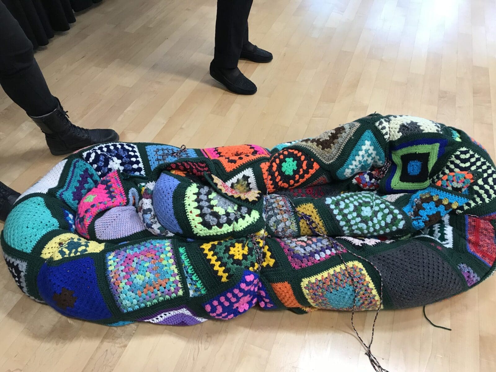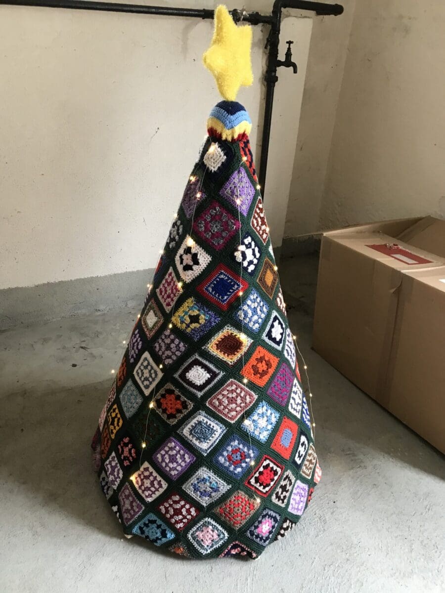 Esther Rüst und Lucia Zingerli haben im März mit einem kleinen Zeitungsinserat Frauen gesucht, die mit ihnen zusammen aus gehäkelten Quadraten einen Weihnachtsbaum gestalten. Ungefähr dreissig Frauen aus der Umgebung haben sich gemeldet und alle haben insgesamt ca. 1500 Quadrate gehäkelt. Die Quadrate entstanden vor allem während der Zeit des Lockdowns und mehrere Frauen haben die beiden Initiantinnen versichert, dass sie glücklich waren, eine Beschäftigung zu haben. Ende Oktober haben sie mit weiteren Häkelfrauen in der Aula des Mühletobelschulhauses den ganzen „Mantel“ zusammengenäht. Dabei haben uns Michèle Müller und Kim Boppart vom „Zelt-Werk“ zusammen mit drei Kolleginnen geholfen.