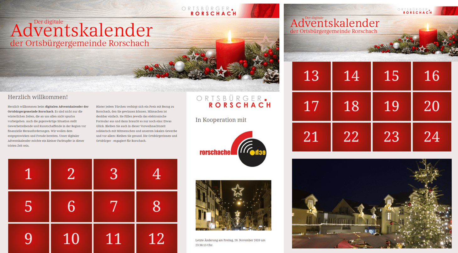 Ab heute 24 Tage in Betrieb. Die Ortsbürger ziehen jeden Tag nach 21 Uhr eine Gewinnerin/einen Gewinner. Am Tag 2 und 11 gibt es je zwei Gewinner, am Tag 10 sogar drei. Die Gewinner werden von den Initianten mit einem Mail orientiert und können dann ihren Preis in der Buchhandlung WörterSpiel abholen. Wichtig: Mail mitnehmen. Viel Glück und herzlichen Dank an die Ortsbürgergemeinde Rorschach für die Umsetzung dieser Idee.