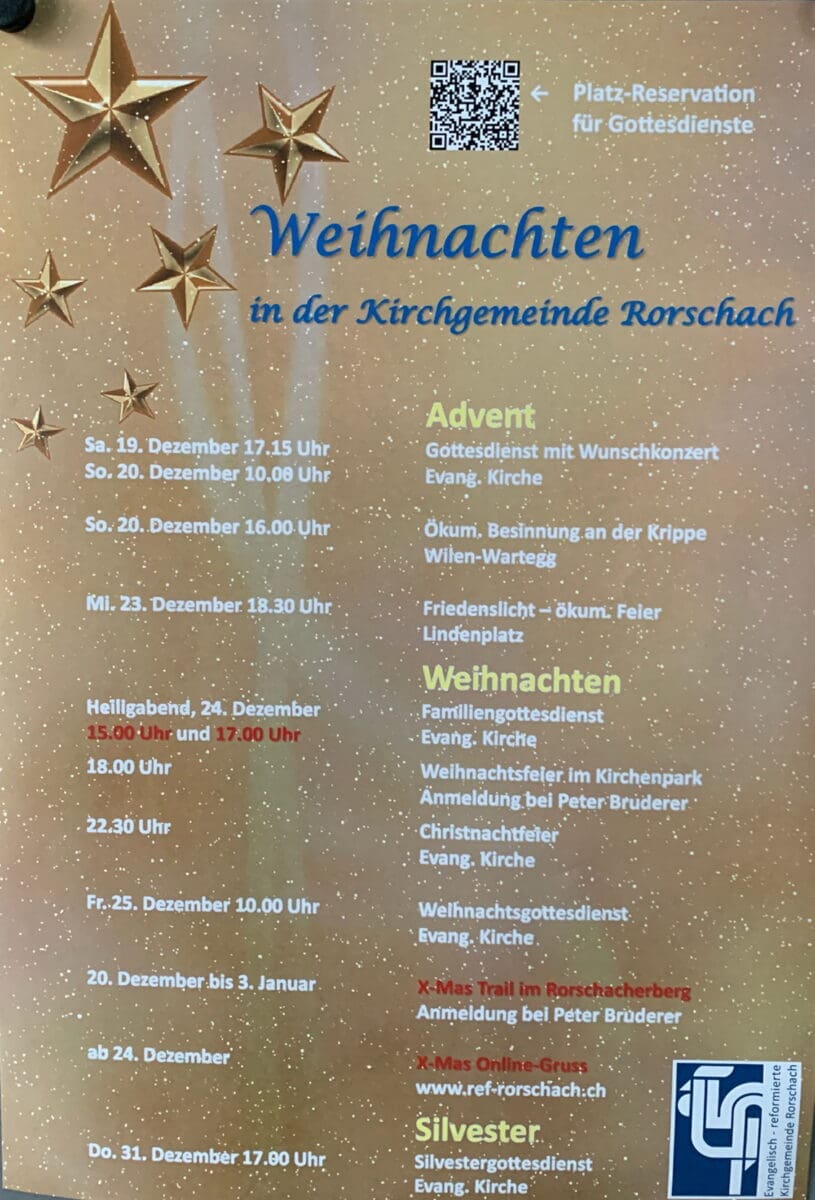 Die Evang.-ref. Kirchgemeinde Rorschach bietet in Coronazeiten die Gottesdienste gleich doppelt an. Einmal heute Samstag (17.15 Uhr) und einmal morgen Sonntag (10.00 Uhr). Und dann wurde bereits das Programm für die Festtage veröffentlicht. Wichtig: Aufgrund der aktuellen Massnahmen sind Veranstaltungen (Gottesdienste gehören in dieses Paket) bis 50 Personen erlaubt. Um sicher einen Platz im Gottesdienst zu haben, kann man diese oder diesen im Voraus reservieren.