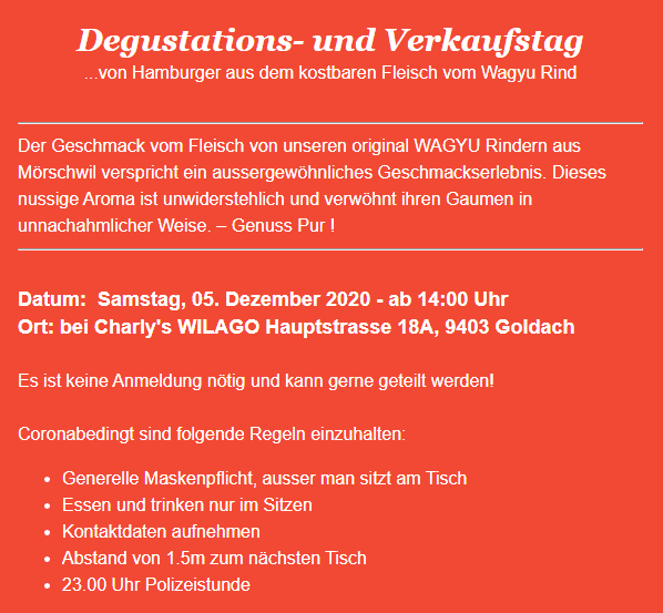 Degustations- & Verkaufstag bei Charly PillerThemen:GoldachKultur 5. Dezember 2020 - 05:30Heute Samstag, 5. Dezember 2020, ab 14 Uhr an der Hauptstrasse 18 a in Goldach. Detailinfos findet man unten.Teilen mit: Einen Link per E-Mail an einen Freund senden (Wird in neuem Fenster geöffnet) E-Mail Drucken (Wird in neuem Fenster geöffnet) Drucken Auf Facebook teilen (Wird in neuem Fenster geöffnet) Facebook Auf X teilen (Wird in neuem Fenster geöffnet) X Auf WhatsApp teilen (Wird in neuem Fenster geöffnet) WhatsApp Gefällt mir:Gefällt mir Wird geladen …Newsletter abonnieren Bitte dieses Feld leer lassenBitte wähle, ob Du über jeden neuen Beitrag sofort oder lieber jeden Morgen gegen 9 Uhr eine Zusammenfassung der neusten Beiträge erhalten möchtest.Liste(n) auswählen: Neues vom Echo (Zusammenfassung) Neues vom Echo (Sofortbenachrichtigung) Dieses Feld wird benötigt.Prüfen Sie Ihren Posteingang und den Spamordner, um Ihr Abonnement zu bestätigen.