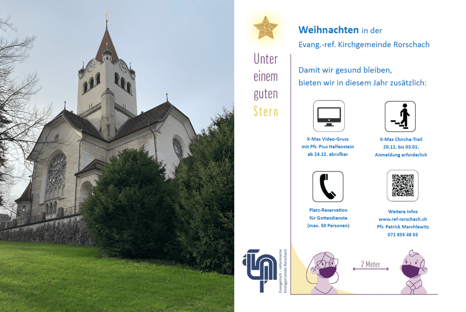 Die Evang.-ref. Kirchgemeinde Rorschach baut ihr Angebot an Gottesdiensten für diese Weihnachten immer weiter aus. Heute Samstag (17.15 Uhr) und morgen Sonntag (10 Uhr) werden die Gottesdienste zum 4. Advent doppelt geführt. An Heiligabend gibt es gleich 4 Gottesdienste (3 Familien-Gottesdienste um 15, 16, 17 und die Christnachtfeier um 22.30 Uhr). Aber auch hier gilt: Platz vorab reservieren. Weitere Informationen findet man hier und hier. Morgen startet dann auch der X-Mas Chirche-Trail. Infos dazu findet man morgen Sonntag hier auf dem Rorschacher Echo.