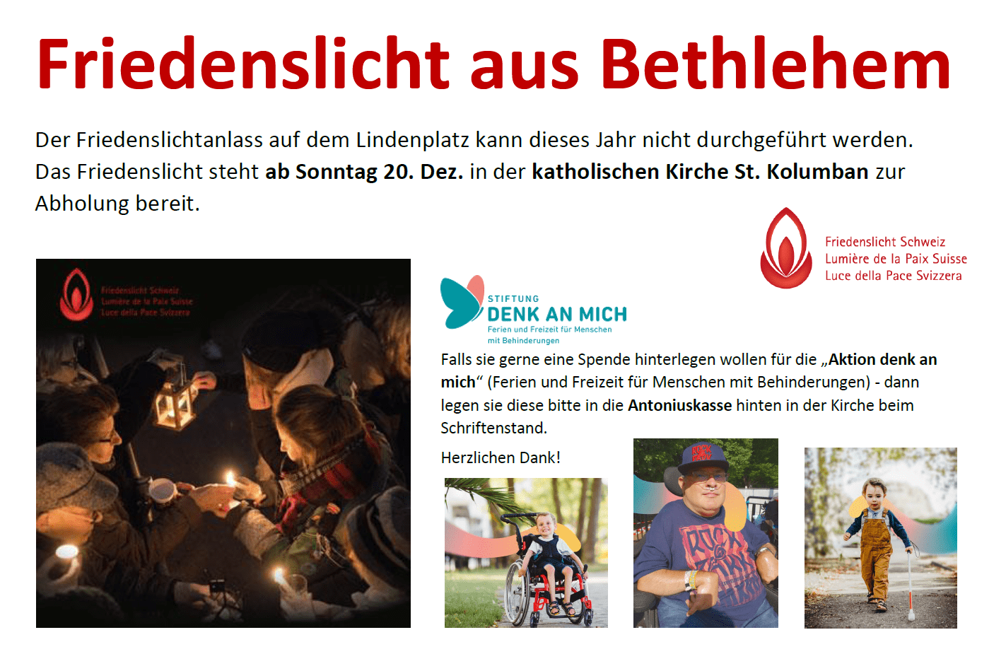 „Ab dem 4. Adventssonntag steht das Licht in der Kolumbanskirche in Rorschach vor dem Altar bereit. Es werden keine Lichtträger verkauft, daher sind wir froh, wenn Sie eigene Lichtträger mitbringen. Wer eine Spende zu Gunsten der «Aktion denk an mich» hinterlassen möchte, kann das gerne über die Antoniuskasse hinten in der Kirche machen. Die Antoniuskasse wird vom 20. – 23. Dezember zugunsten der ‚Aktion denk an mich‘ geleert. Das Friedenslicht kann auch am 24. Dezember nach der Familienweihnachtsfeier vor der Kolumbanskirche mitgenommen werden. Es steht vor dem Haupteingang bereit“, heisst es in der entsprechenden Mitteilung. (Text/Bild: pd)