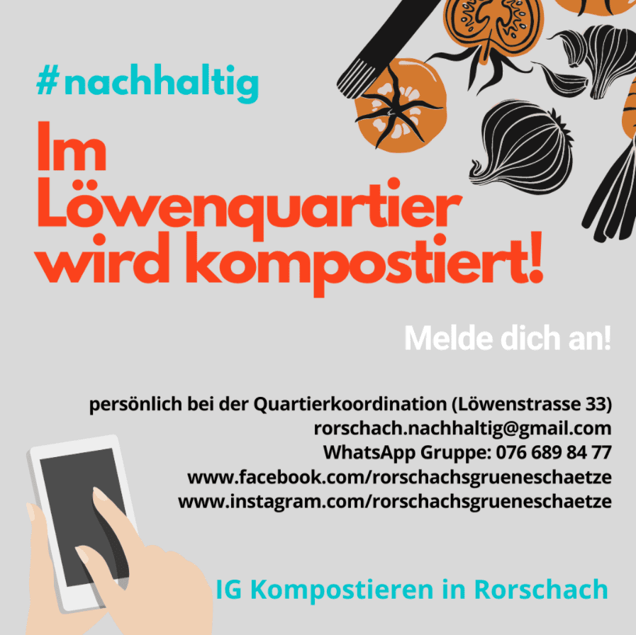 Kompostieren: Eine gute Idee wird in Rorschach umgesetztThemen:Rorschach 28. Januar 2021 - 05:42Das Pilotprojekt „Rorschachs grüne Schätze“ wurde kürzlich lanciert und soll nachhaltig sein. Weitere Infos findet man auf Facebook und Instagram. Kontakt aufnehmen kann man hier per Mail oder über die WhatApp Gruppe über 076 689 84 77.Teilen mit: Einen Link per E-Mail an einen Freund senden (Wird in neuem Fenster geöffnet) E-Mail Drucken (Wird in neuem Fenster geöffnet) Drucken Auf Facebook teilen (Wird in neuem Fenster geöffnet) Facebook Auf X teilen (Wird in neuem Fenster geöffnet) X Auf WhatsApp teilen (Wird in neuem Fenster geöffnet) WhatsApp Gefällt mir:Gefällt mir Wird geladen …Newsletter abonnieren Bitte dieses Feld leer lassenBitte wähle, ob Du über jeden neuen Beitrag sofort oder lieber jeden Morgen gegen 9 Uhr eine Zusammenfassung der neusten Beiträge erhalten möchtest.Liste(n) auswählen: Neues vom Echo (Zusammenfassung) Neues vom Echo (Sofortbenachrichtigung) Dieses Feld wird benötigt.Prüfen Sie Ihren Posteingang und den Spamordner, um Ihr Abonnement zu bestätigen.