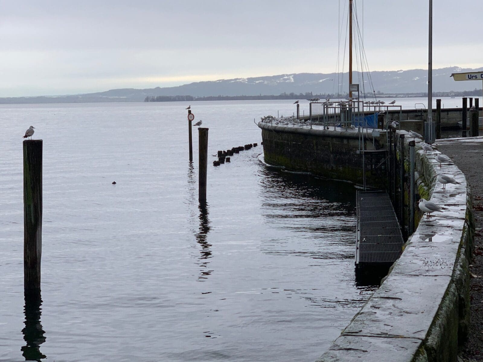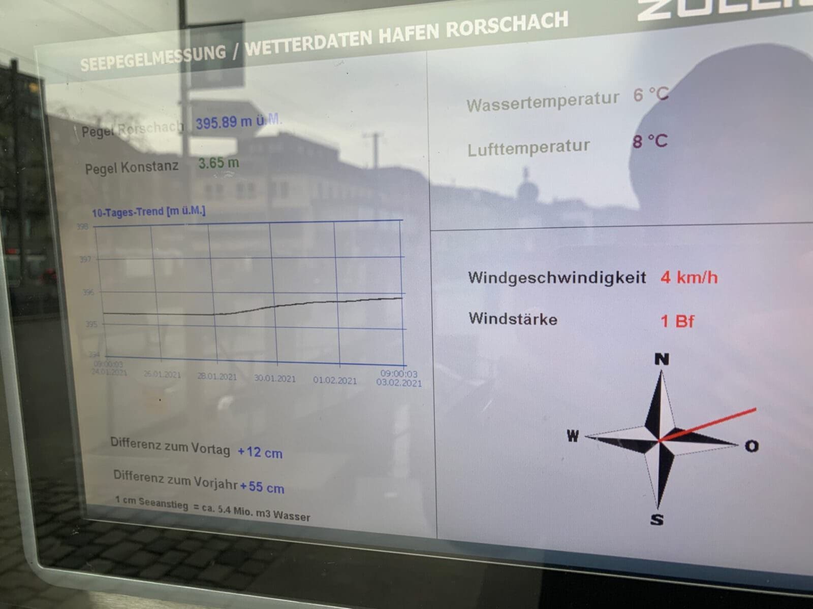 Es bleibt grau in grau, aber zumindest ist es bei leichtem Nieselregen etwas milder als in den letzten Tagen. Die Niederschläge haben auch den Pegel des Bodensees leicht ansteigen lassen: Heute morgen hat die Anzeige beim Kornhaus einen Stand von 395.86 gezeigt. Das sind 12 cm mehr wie am Dienstag und entspricht einer Wassermenge von 64,8 Millionen Kubikmetern.