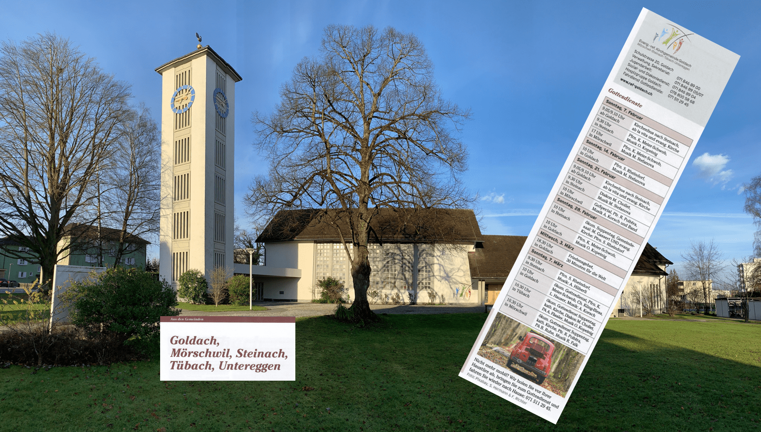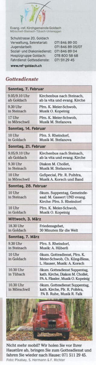 Integriert in diese Kirchgemeinde sind Goldach, Mörschwil, Steinach, Tübach und Untereggen. Heute Sonntag finden die Gottesdienste in Steinach (09.30 Uhr) und Mörschwil (17 Uhr) statt. Umfassende Informationen aus dem vielseitigen Angebot dieser Kirchgemeinde findet man auf der Homepage. Da werden immer auch die aktuellen Änderungen publiziert.