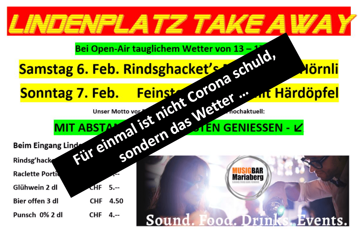 Kein Lindenplatz Take-Away heute NachmittagThemen:BeizenRorschach 7. Februar 2021 - 11:59Angesichts der schlechten Wetteraussichten haben Reto und Myri entschieden, heute Nachmittag in der warmen Stube zu bleiben …Teilen mit: Einen Link per E-Mail an einen Freund senden (Wird in neuem Fenster geöffnet) E-Mail Drucken (Wird in neuem Fenster geöffnet) Drucken Auf Facebook teilen (Wird in neuem Fenster geöffnet) Facebook Auf X teilen (Wird in neuem Fenster geöffnet) X Auf WhatsApp teilen (Wird in neuem Fenster geöffnet) WhatsApp Gefällt mir:Gefällt mir Wird geladen …Newsletter abonnieren Bitte dieses Feld leer lassenBitte wähle, ob Du über jeden neuen Beitrag sofort oder lieber jeden Morgen gegen 9 Uhr eine Zusammenfassung der neusten Beiträge erhalten möchtest.Liste(n) auswählen: Neues vom Echo (Zusammenfassung) Neues vom Echo (Sofortbenachrichtigung) Dieses Feld wird benötigt.Prüfen Sie Ihren Posteingang und den Spamordner, um Ihr Abonnement zu bestätigen.