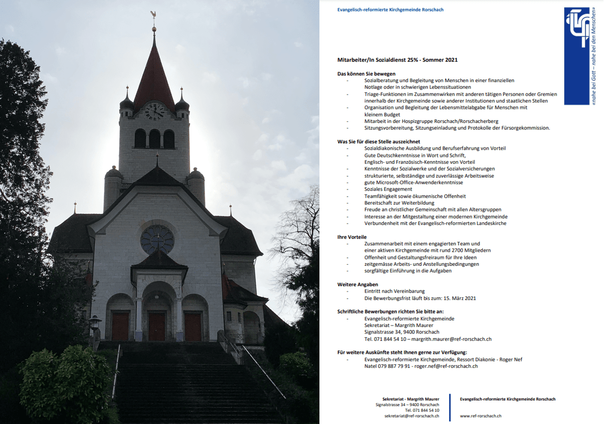 Die langjährige Mitarbeiterin im Sozialdienst der Evang.-ref. Kirchgemeinde Rorschach, Rita Dornbierer, wird im Sommer 2021 pensioniert. Weitere Informationen zur ausgeschriebenen