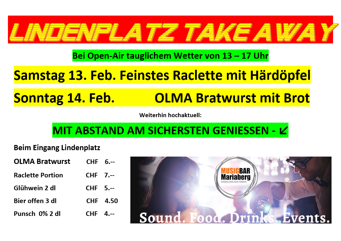 Es ist schon nicht so, dass diese Bratwurst gestern 10 Franken gekostet hat, obwohl das Plakat einem das so mitteilen wollte. Die Bratwurst kostete gestern schon Fr. 6.00, wie es jetzt auch richtig auf dem Flyer steht. Kontrollieren kann man das heute zwischen 13 und 17 Uhr auf dem Lindenplatz, wenn Reto und Myri den Take-Away-Modus der Musigbar Mariaberg zelebrieren. Und die Bratwurst wird 6 Franken kosten. Garantiert.