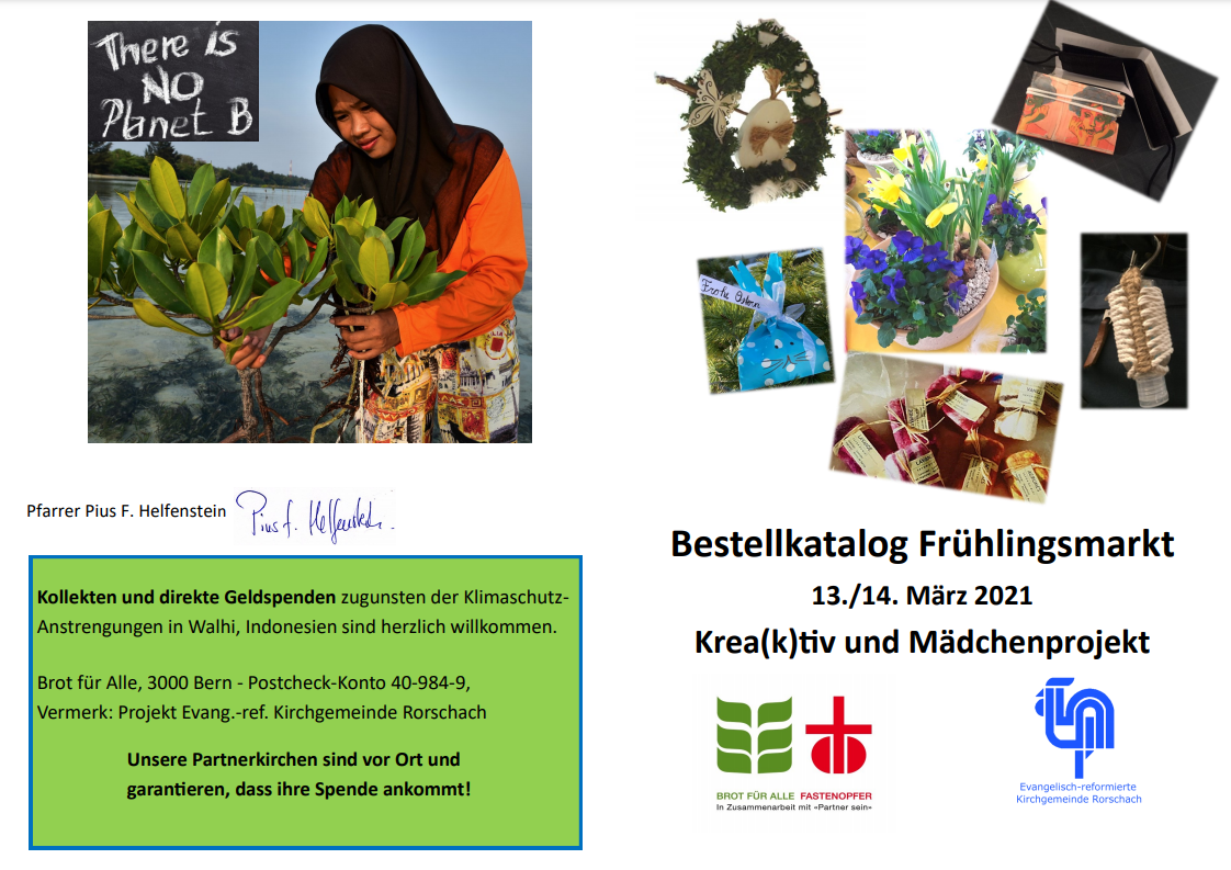Frühlingsmarkt mit Bestellkatalog: Die Evang. -ref. Kirchgemeinde Rorschach bietet die Verkaufsartikel des beliebten Frühlingsmarkts in diesem Jahr auf Bestellung an. Die Krea(k)tiv – Gruppe und das Mädchenprojekt haben Ostergestecke, Kränze und weitere schöne Sachen gefertigt. All das kann bis Dienstag, 2. März online oder mit den aufliegenden Warenkatalogen bestellt werden. Abholtermine sind Samstag, 13. März von 9h-11h; Sonntag, 14. März im Anschluss an den Brot-für-alle-Familiengottesdienst von 11h-12h oder nach Vereinbarung – jeweils im Haus GleisK (Neubau).