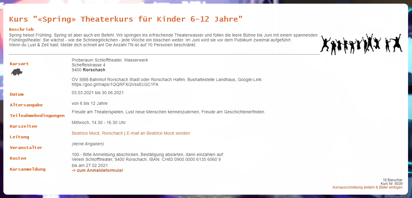 Ab dem 3. März bis am 30. Juni 2021 veranstaltet das Schlofftheater einen weiteren Theaterkurs in Rorschach. Die nötigen Infos finden Interessierte im Flyer oder auf diesem Link . Anmeldeschluss: für diesen Kurs ist der 27. Februar 2021. Mit Beatrice Mock in Kontakt treten kann man hier.