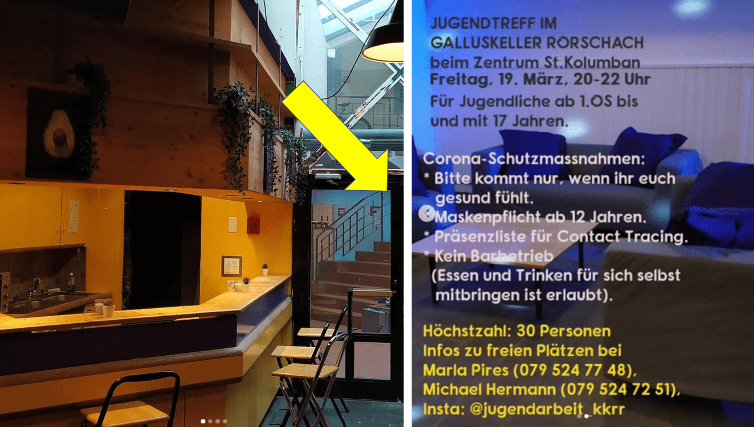 «Juhui! Endlich ist es soweit, wir eröffnen am kommenden Freitag, 19. März von 20:00 – 22:00 Uhr den Jugendtreff im Galluskeller in Rorschach! Ihr dürft Euch auf einen coolen Abend mit toller Musik, vielen Spielmöglichkeiten und chilligen Sofaecken freuen! Für alle Jugendlichen ab der 1. Oberstufe bis 17 Jahre. Aktuelle Corona-Massnahmen sowie unseren Kontakt findet ihr im letzten Abschnitt des Videos», schreiben die InitiantInnen in ihrer Mitteilung. Das angedeutete Video findet man hier.