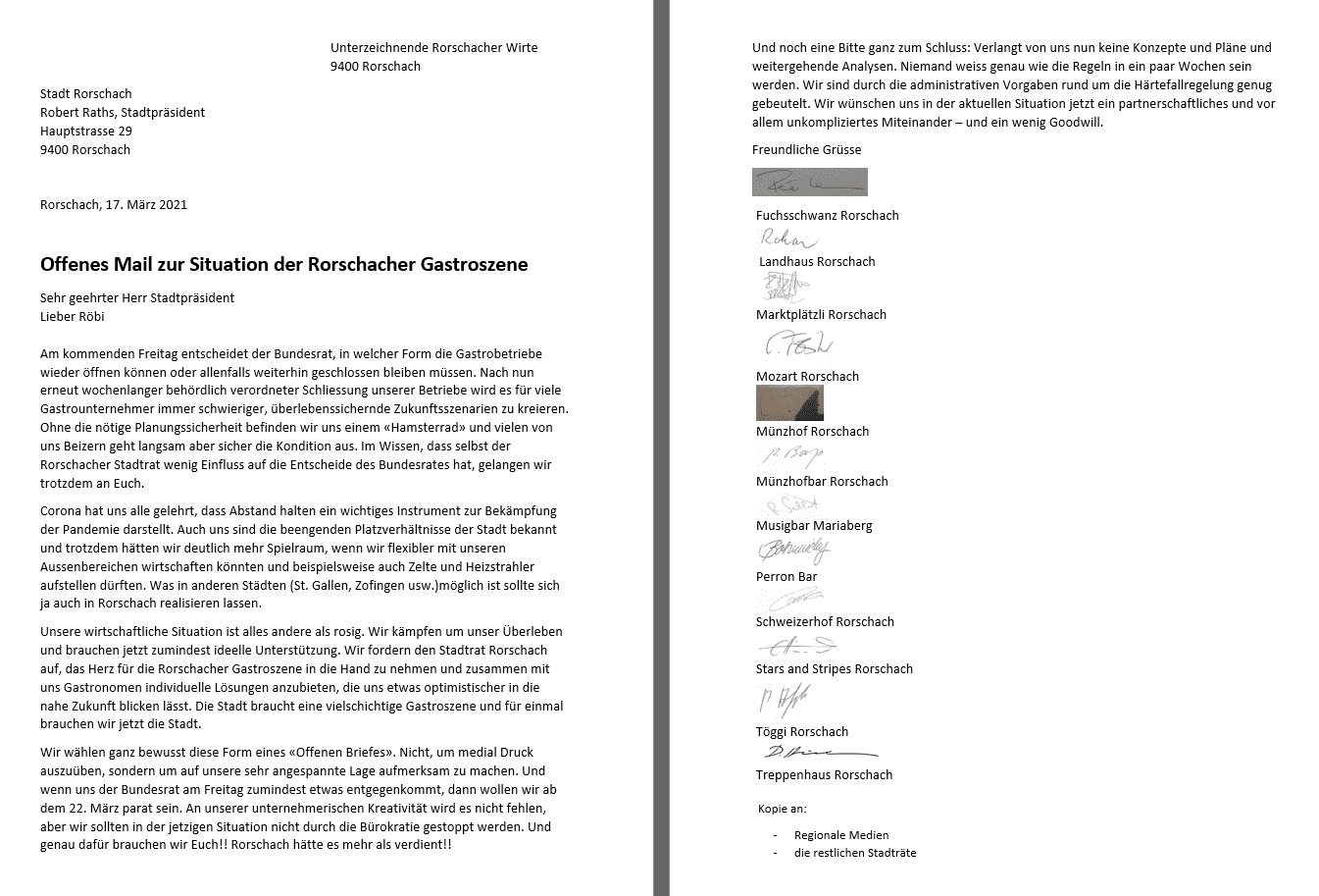 Wir wählen ganz bewusst diese Form eines «Offenen Briefes». Nicht, um medial Druck auszuüben, sondern um auf unsere sehr angespannte Lage aufmerksam zu machen. Und wenn uns der Bundesrat am Freitag zumindest etwas entgegenkommt, dann wollen wir ab dem 22. März parat sein. An unserer unternehmerischen Kreativität wird es nicht fehlen, aber wir sollten in der jetzigen Situation nicht durch die Bürokratie gestoppt werden. Und genau dafür brauchen wir Euch!! Rorschach hätte es mehr als verdient!!