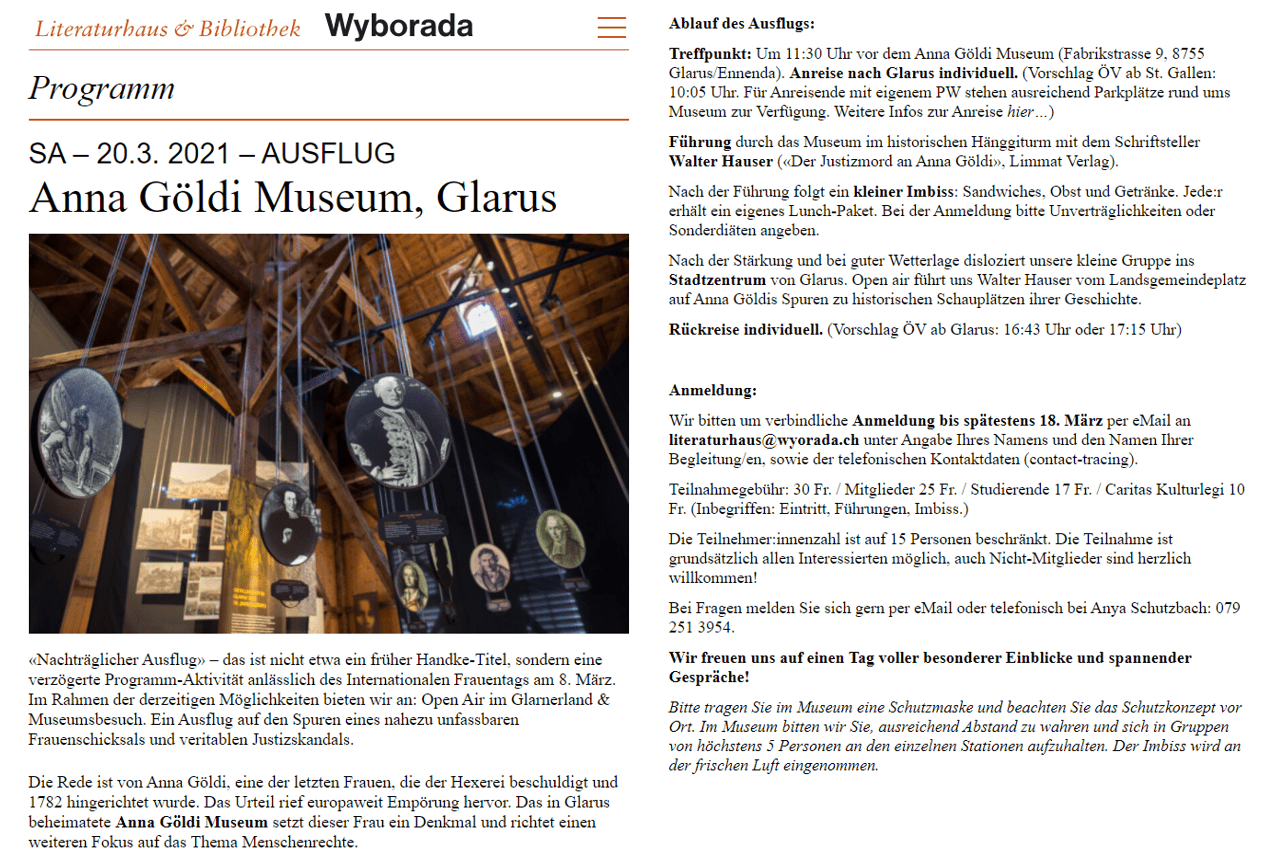 Das Literaturhaus „Wyborada“ St.Gallen bietet für kommenden Samstag, 20. März, einen literarisch-historischen Ausflug nach Glarus (!) an; eine für viele Literatur- und Kulturfans nach der langen Abstinenz sicher interessante Sache. So viele lechzen doch jetzt wieder nach kulturellen Angeboten… Mehr Infos gibt es hier. Zum Anna Gödli-Museum hier. Am 25. April aber hat Wyborada einen direkten Bezug zu Rorschach. Dann findet eine Lesung mit Anna Stern statt. Infos dazu folgen.