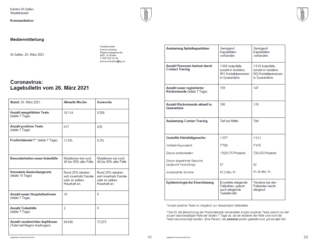 Wie immer beziehen sich die Daten von Freitag bis Freitag. Unten findet man eine weitere Mitteilung der Staatskanzlei St.Gallen, die heute Vormittag verschickt wurde:
