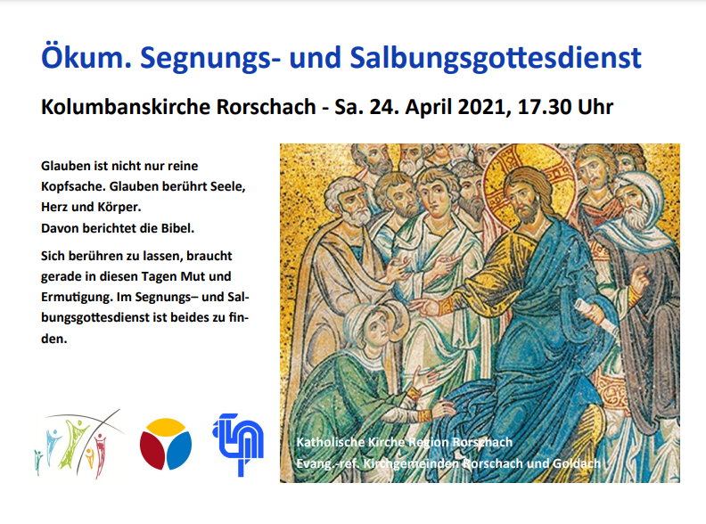 Das Programm der Evang.-ref. Kirchgemeinde Goldach bietet heute um 17.30 Uhr einen ökumenischen Segnungs- und Salbungsgottesdienst in der Kolumbanskirche Rorschach und morgen um 10 Uhr einen Gottesdienst in der Kirche Goldach.
