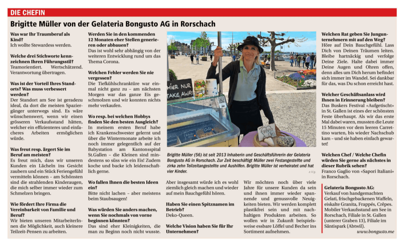 Brigitte Müller von der Gelateria Bongusto wird heute in den Bodensee Nachrichten auf Seite 3 portraitiert. Im realen Leben findet man sie und ihr Team auf dem Platz vor dem Pavillon am Rorschacher Hafen.