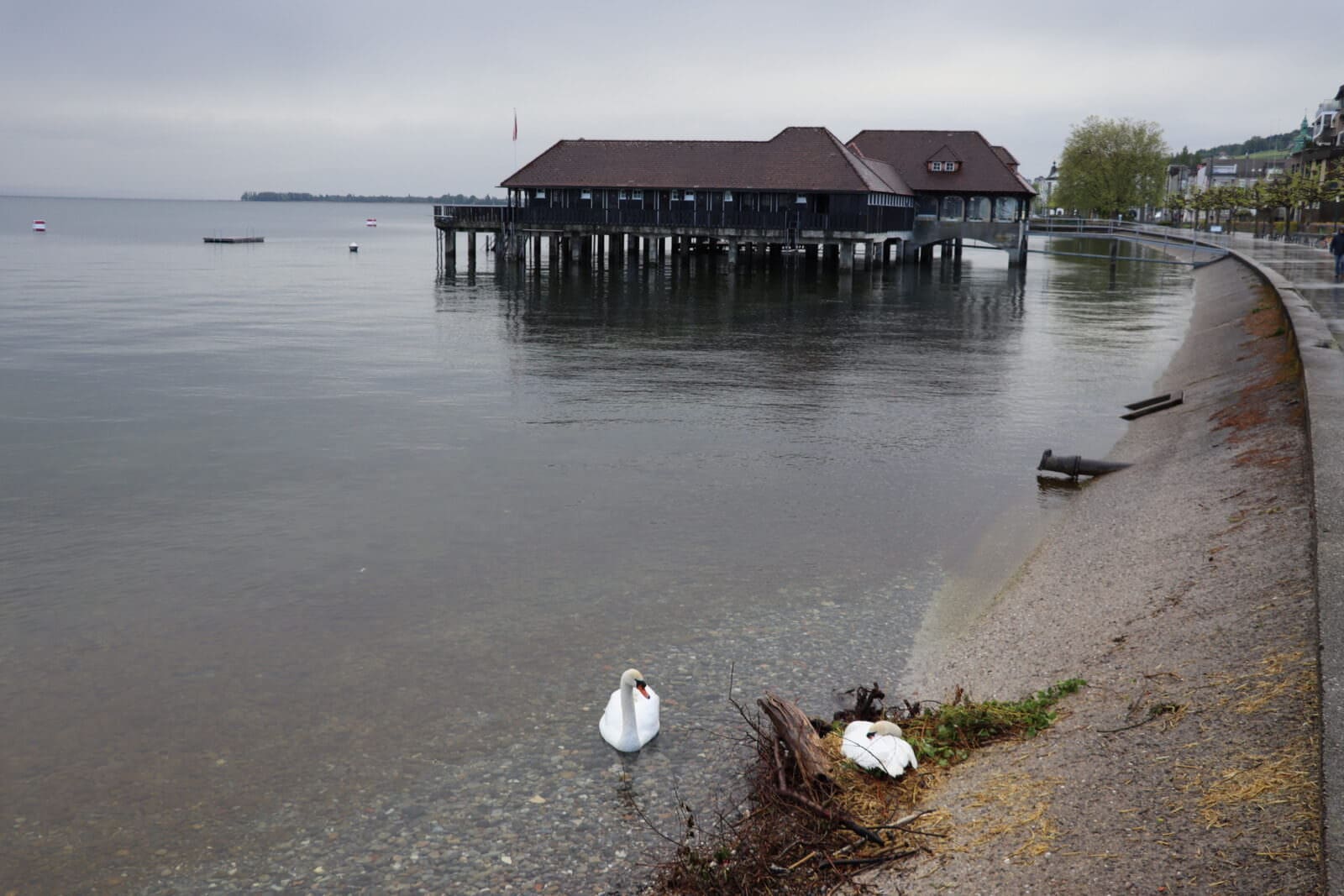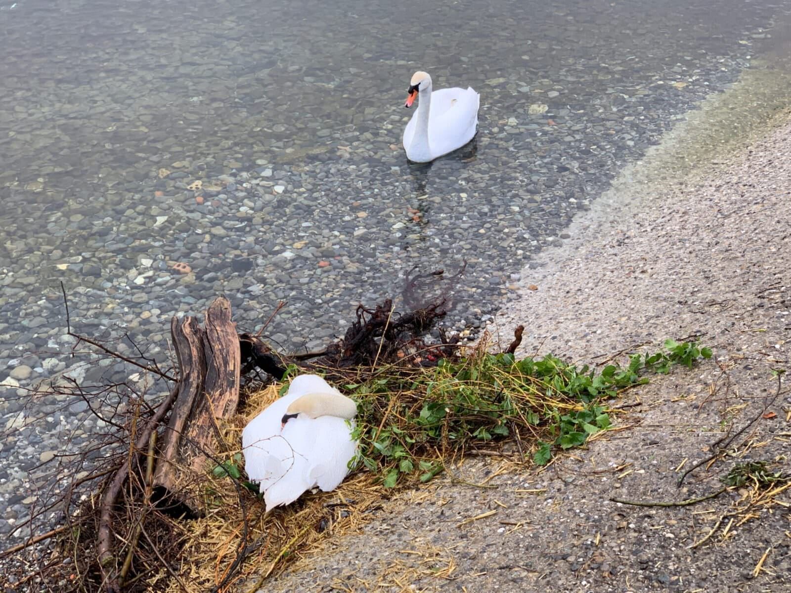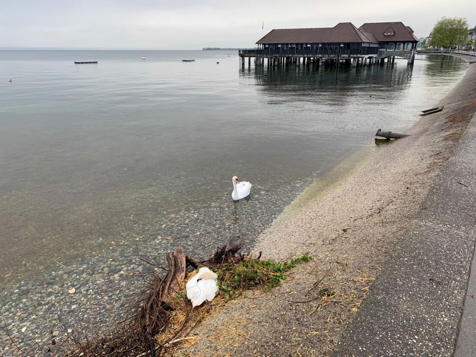 No news von der Schwanenfront. Beide Nester sind weiterhin besetzt. Auffallend ist lediglich, dass das Nest beim Arion so etwas wie „befestigt“ wurde und dass das Nest beim Seerestaurant nun ganz in die Ecke jenes Unterstandes versetzt wurde. Hier Bilder, wie sich die Schwanennester heute Vormittag präsentiert haben. Grundsätzlich gilt auch hier: Der Weg ist das Ziel. Das Rorschacher Echo bleibt am Ball, resp. am Nest…