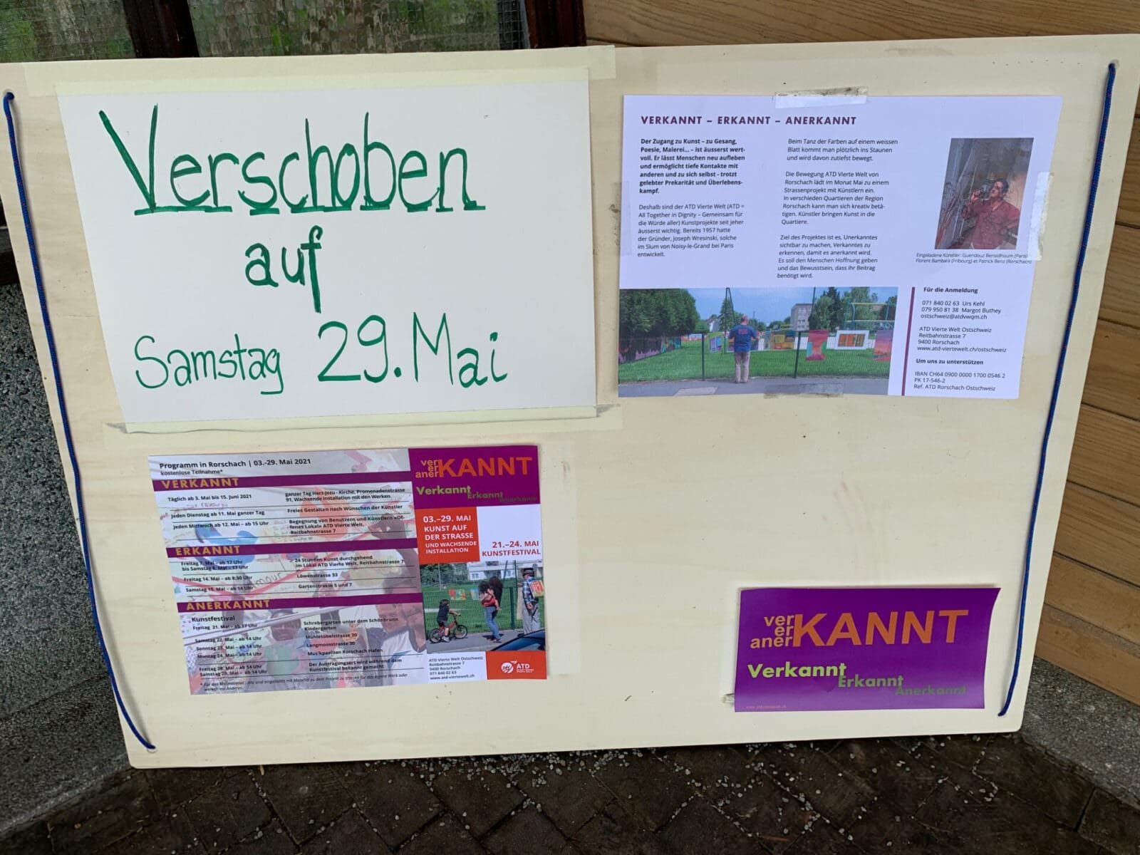 Das Kunstfestival von ATD Vierte Welt Ostschweiz hat in den letzten Woche einige Werke kreiert, die in der Rorschacher Herz-Jesu-Kirche und in deren Umfeld zu besichtigen sind. Die Installation „Verkannt – Erkannt – Anerkannt“ hat einiges an Kreativität hervorgebracht. Die Ausstellung bleibt bis am 15. Juni stehen. Hier ein paar Bilder davon.