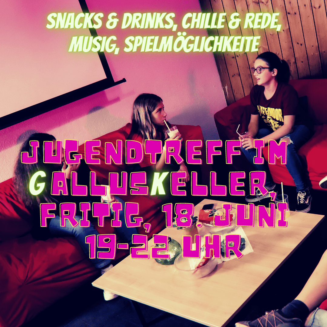 «Jugendtreff im Gallus Keller beim Kolumbanszentrum Rorschach ist am kommenden Freitag (18.06.) offen. Für Jugendliche ab 1.OS bis und mit 17 Jahren. Infos bei Marla Pires (079 524 77 48), Michael Hermann (079 524 72 51), Insta: @jugendarbeit_kkrr. Neu mit Barbetrieb (Getränke, Pizza und Snacks). Es gelten die aktuellen Corona-Schutzmassnahmen. Mir freued üs uf Di!», schreiben die InitiantInnen.