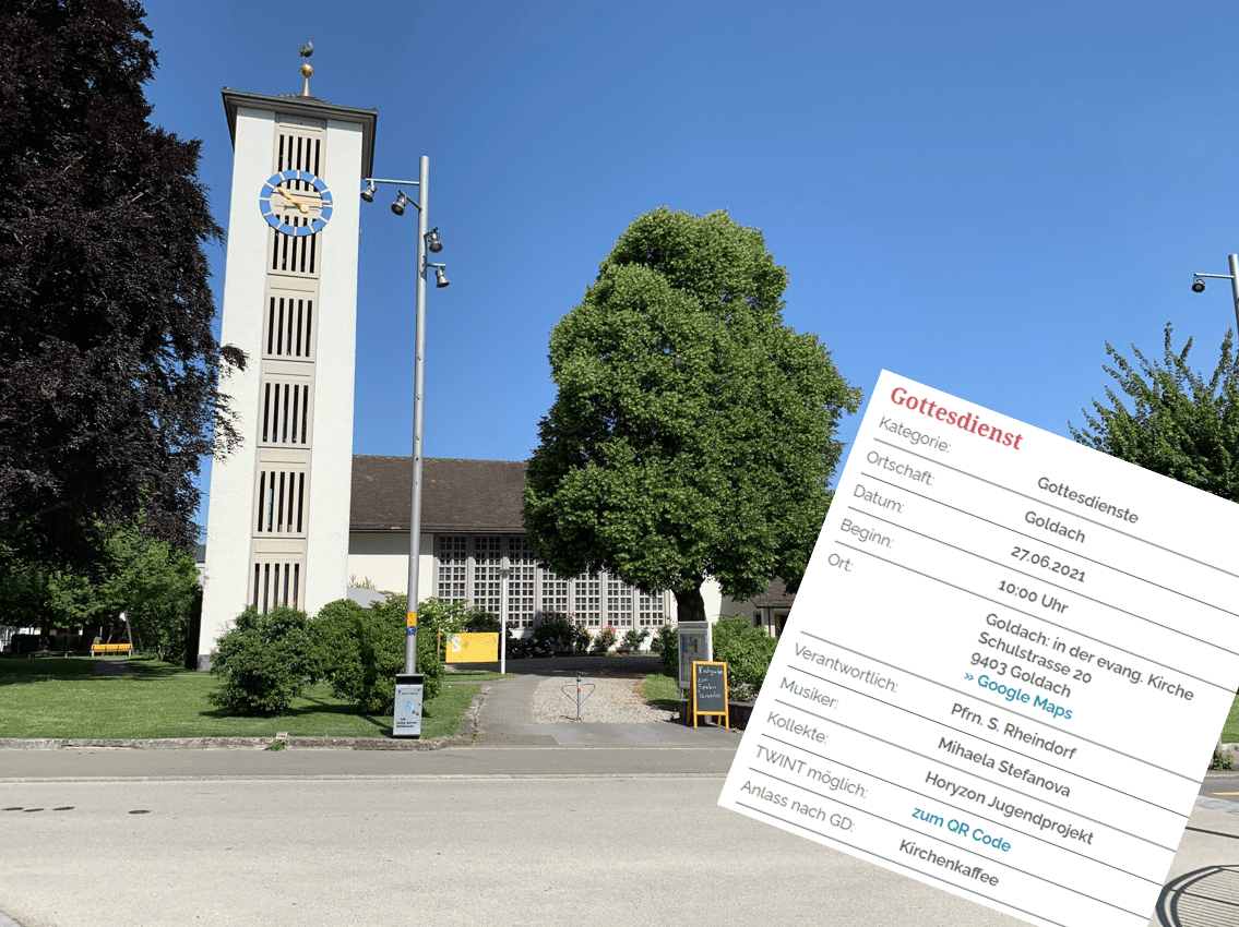 Die Evang.-ref. Kirchgemeinde Goldach feiert morgen um 10 Uhr den Gottesdienst in der Kirche in Goldach. Mehr über das vielfältige Angebot dieser Kirchgemeinde findet man auf der Homepage.