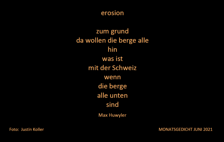 Das Monatsgedicht an die Freunde der LyrikThemen:KulturRegionRorschach 29. Juni 2021 - 05:10Kurz und prägnant. Text und Bild verstärken einander. Foto made by Justin Koller, Gedicht von Max Huwyler.Teilen mit: Klicken, um einem Freund einen Link per E-Mail zu senden (Wird in neuem Fenster geöffnet) E-Mail Klicken zum Ausdrucken (Wird in neuem Fenster geöffnet) Drucken Klick, um auf Facebook zu teilen (Wird in neuem Fenster geöffnet) Facebook Klicke, um auf X zu teilen (Wird in neuem Fenster geöffnet) X Klicken, um auf WhatsApp zu teilen (Wird in neuem Fenster geöffnet) WhatsApp Gefällt mir:Gefällt mir Wird geladen …Newsletter abonnieren Bitte dieses Feld leer lassenBitte wähle, ob Du über jeden neuen Beitrag sofort oder lieber jeden Morgen gegen 9 Uhr eine Zusammenfassung der neusten Beiträge erhalten möchtest.Liste(n) auswählen: Neues vom Echo (Zusammenfassung) Neues vom Echo (Sofortbenachrichtigung) Dieses Feld wird benötigt.Prüfen Sie Ihren Posteingang und den Spamordner, um Ihr Abonnement zu bestätigen.