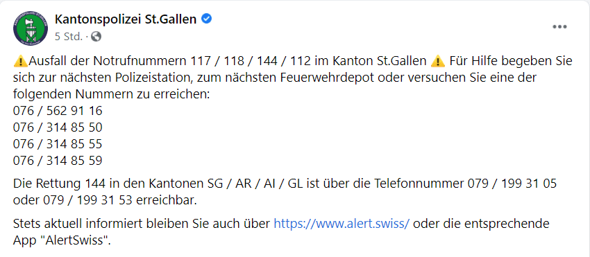 Hier vorerst Nummern, die die Kantonspolizei St.Gallen veröffentlicht hat. Im Notfall muss man diese wählen.