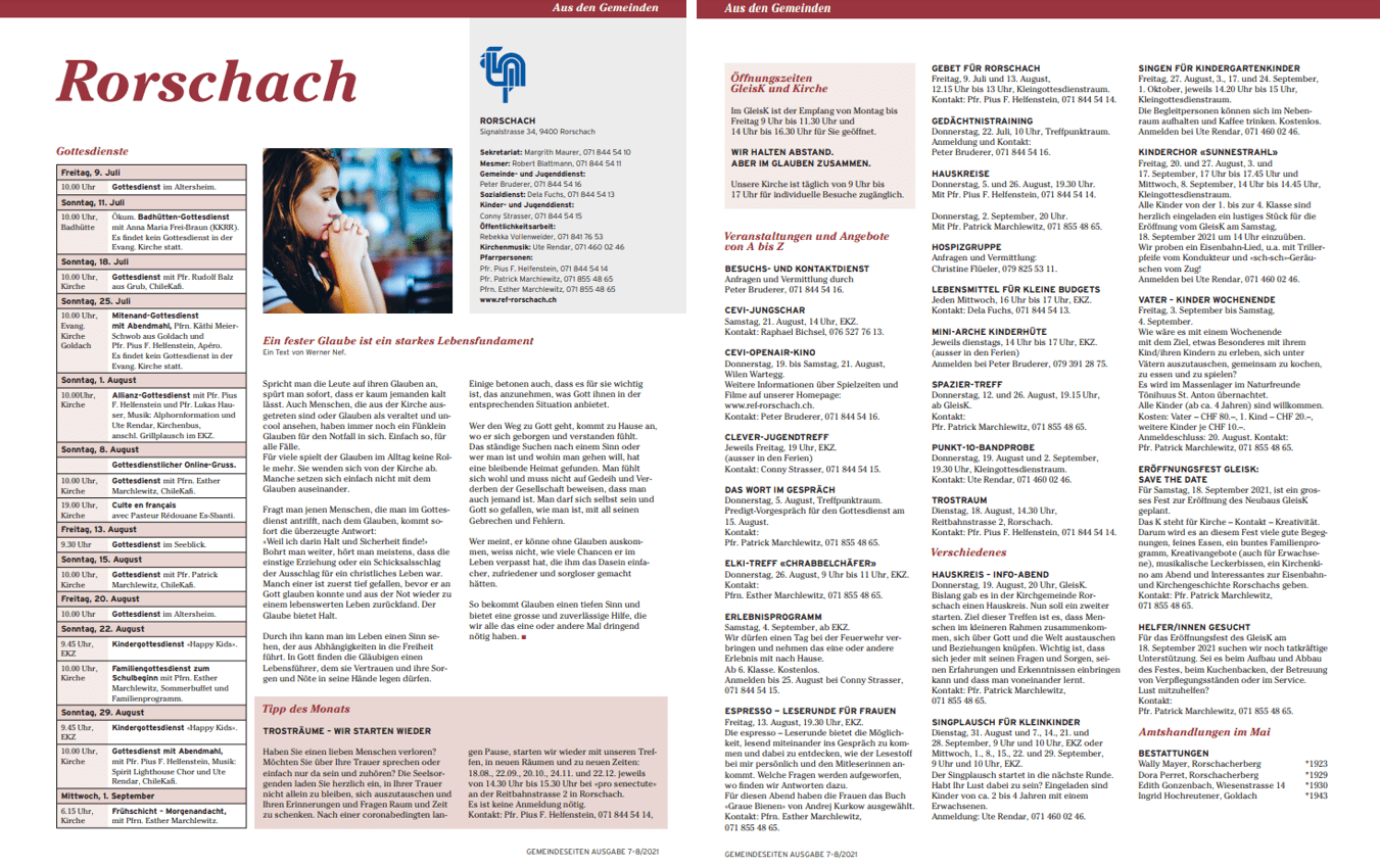 Morgen Sonntag findet der traditionelle ökumenische Gottesdienst in der Badhütte statt. Beginn ist um 09.30 Uhr (nicht um 10 Uhr). Hier eine Gesamtübersicht der Anlässe und Veranstaltungen der Evang.-ref. Kirchgemeinde Rorschach. Detaillierte Informationen findet man auf der Homepage.
