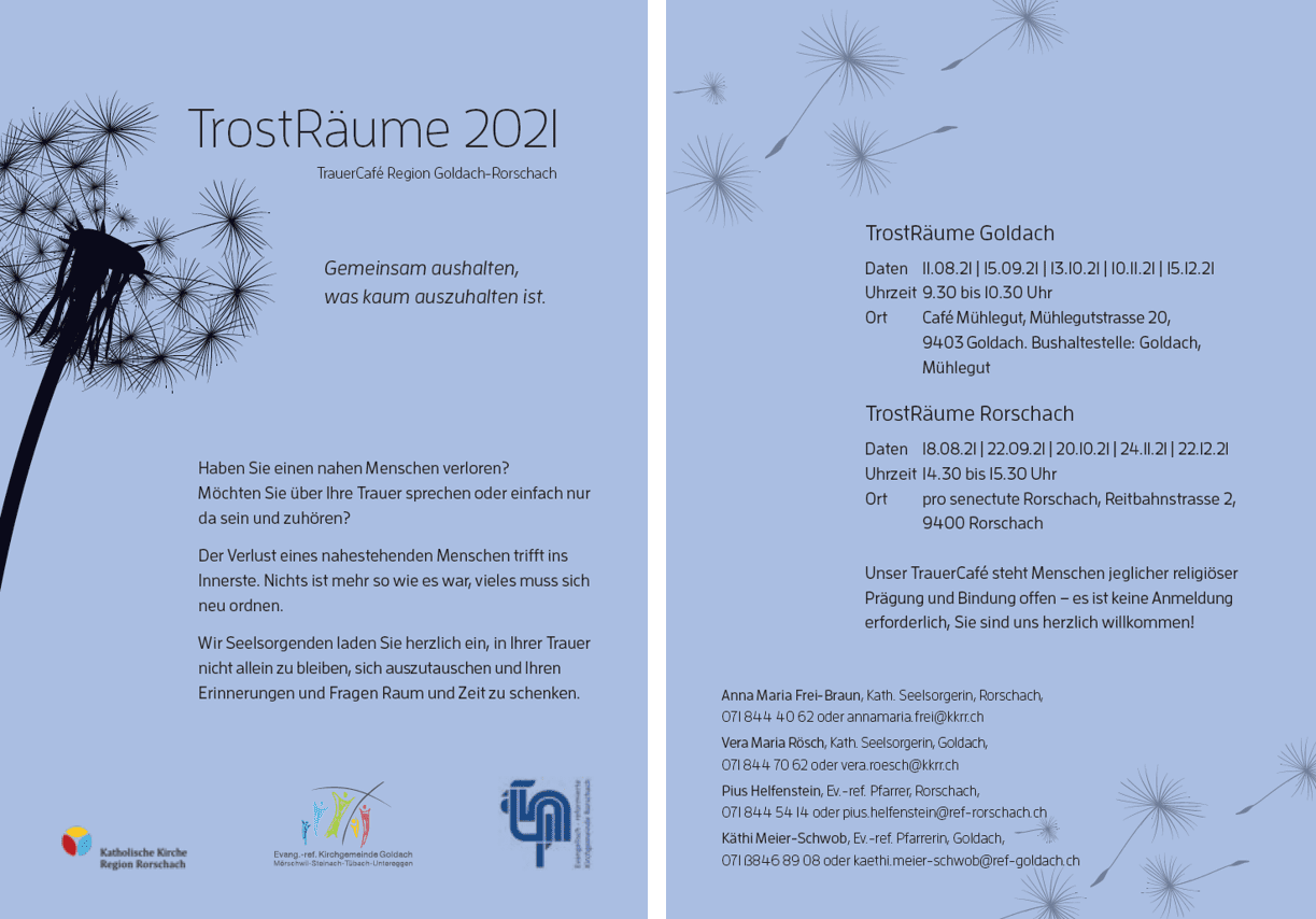 Wir Seelsorgenden laden Sie herzlich ein, in Ihrer Trauer nicht allein zu bleiben, sich auszutauschen und Ihren Erinnerungen und Fragen Raum und Zeit zu schenken. Vielleicht sind die TrostRäume eine Möglichkeit, ein bisschen Kraft und Mut zu schöpfen?