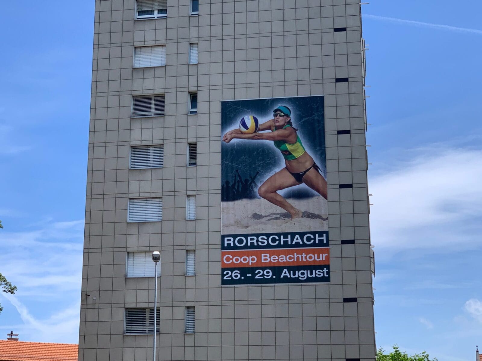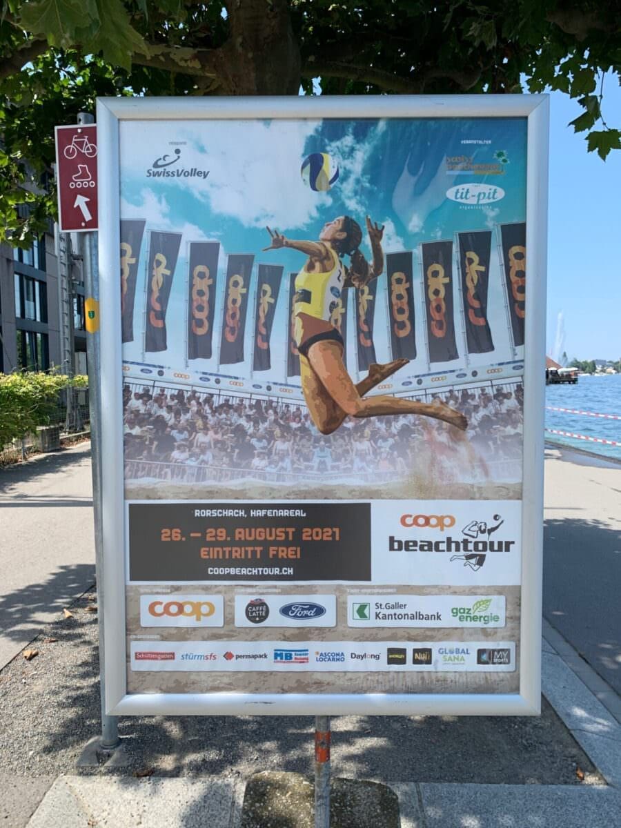 Der Platz am Rorschach Hafen blickt auf abwechslungsreiche Tage zurück. Zuerst das Zelt-Werk, dann gestern der grosse Flohmarkt mit insgesamt rund 150 Ausstellern und bereits morgen beginnt der Aufbau für das nächste Rorschacher Highlight: Coopbeachtour. Und die Werbung für diesen Anlass ist nun wirklich nicht zu übersehen…
